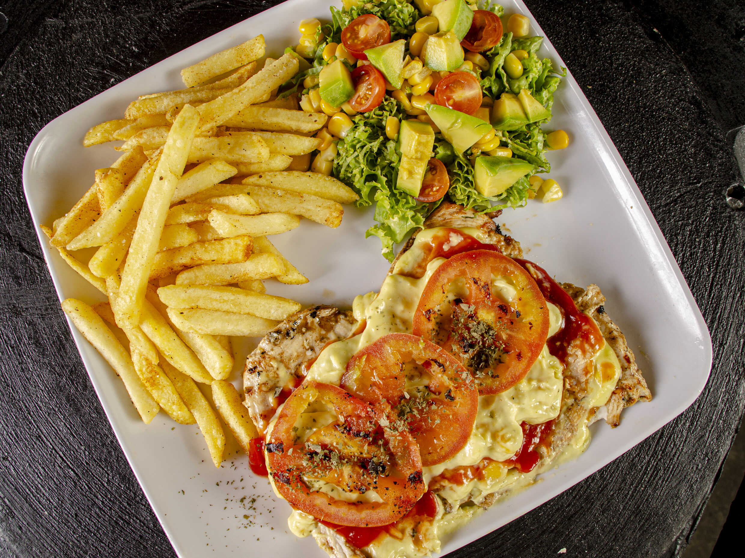 250 g De pechuga de pollo con queso mozzarella y tomates.
