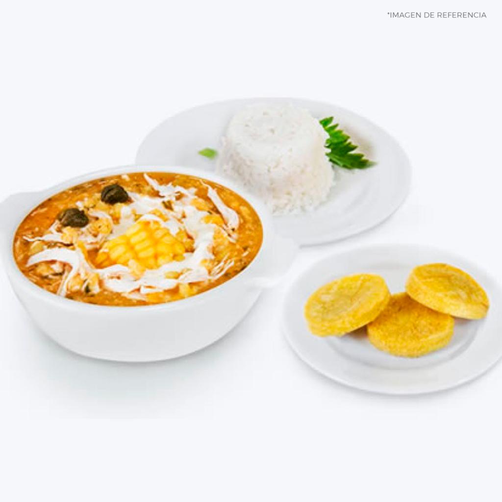 Disfruta de una porción personal de ajiaco con pollo desmenuzado, mazorca, acompañado de una porción de arroz parbolizado, tres arepas fritas, crema de leche y alcaparras.