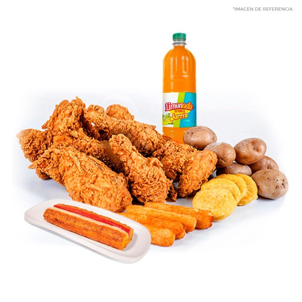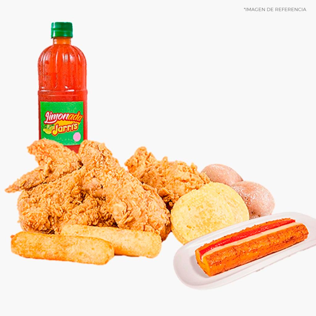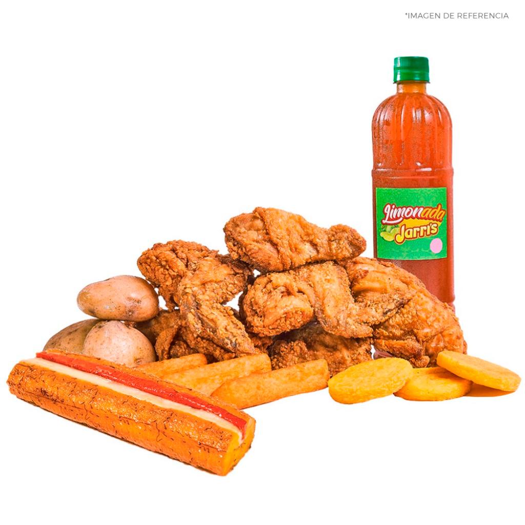 * 8 presas de pollo tradicional con papa, yuca frita y arepa * Gaseosa 1,5 L (sabor sujeto a disponibilidad) * 1 copa de la nueva salsa tártara Jarri’s 4 oz