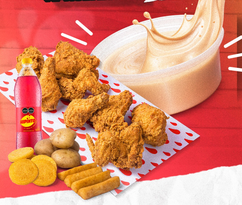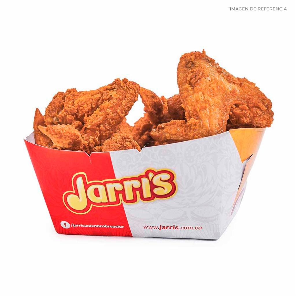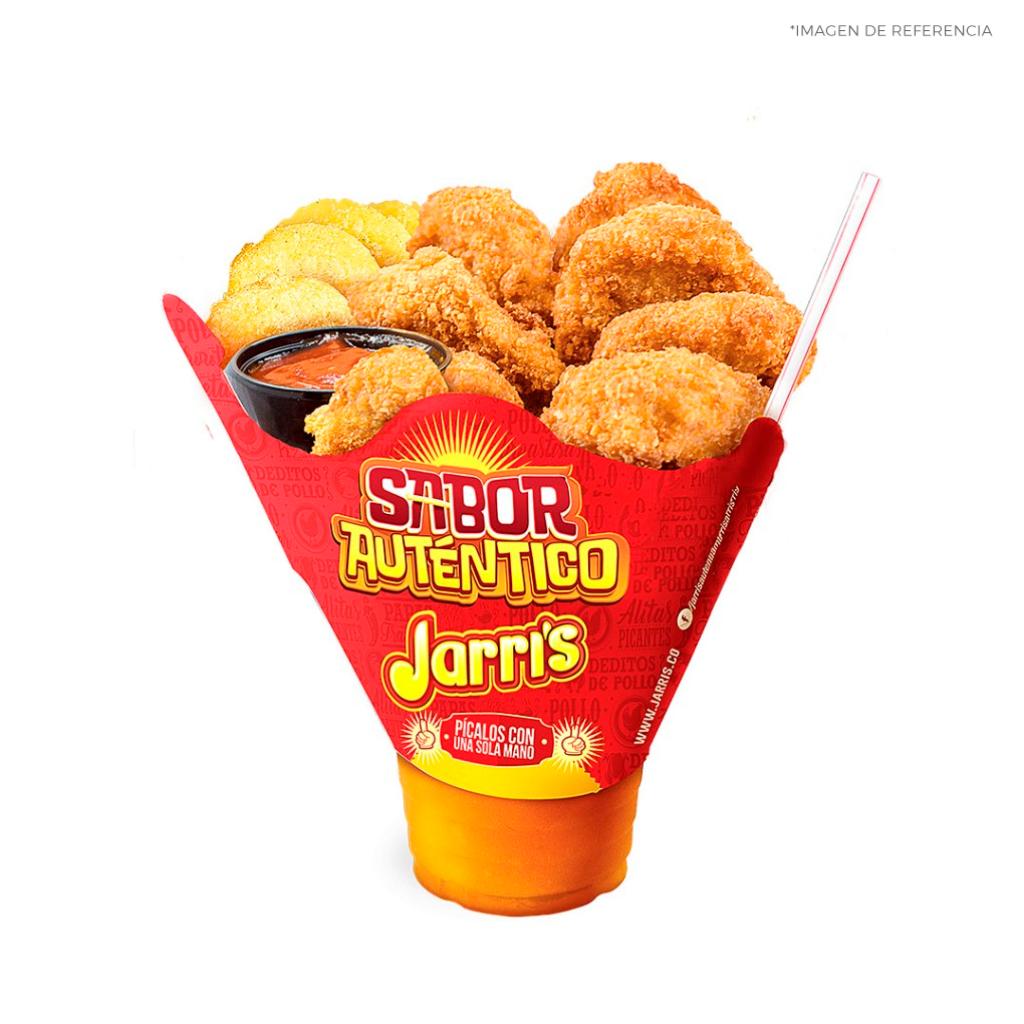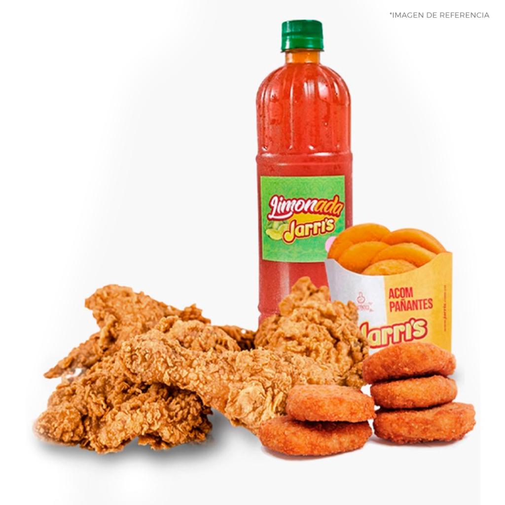 * 8 presas de pollo tradicional con papa, yuca frita y arepa * Gaseosa 1,5 L (sabor sujeto a disponibilidad) * 1 copa de la nueva salsa tártara Jarri’s 4 oz