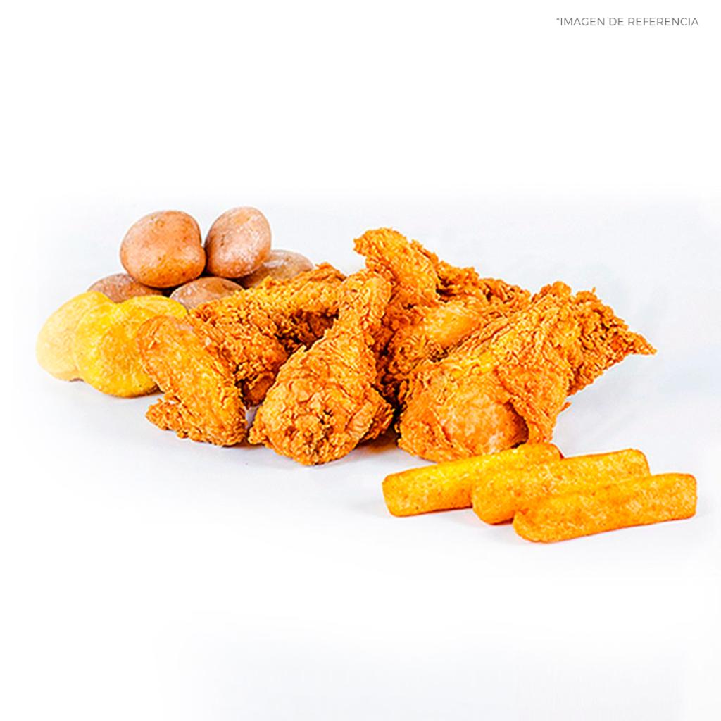 La mejor opción para probar en un solo momento algunos de nuestros mejores apanados y acompañamientos, ideal para compartir. 8 Croquetas de pollo, 7 deditos de pollo,8 trocitos de pollo, 8 piezas de alas, 2 maduros rellenos medianos, 6 arepas, 6 yucas, 1 ensalada agridulce, salsa rancho y miel mostaza.