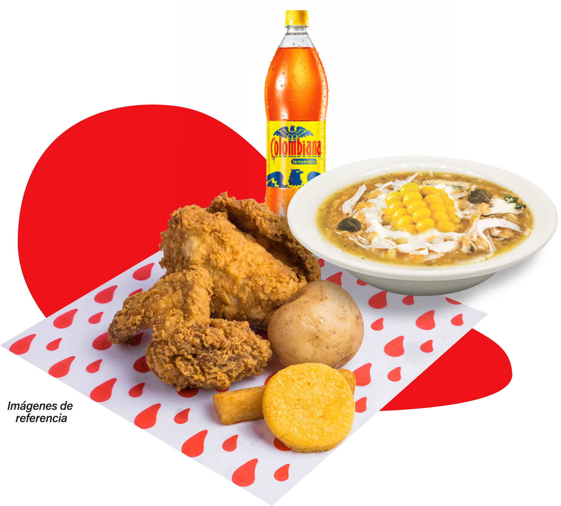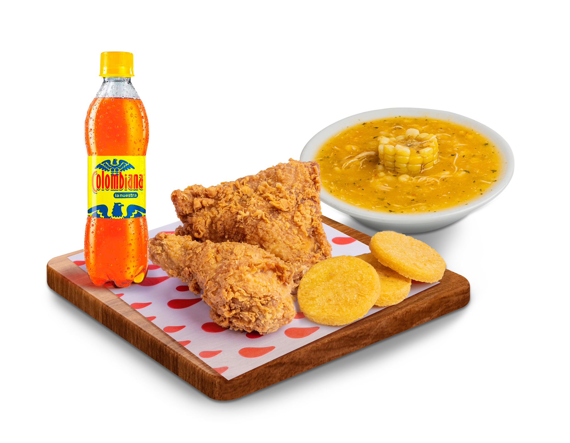 2 Presas broaster (Pierna pernil o pechuga ala), 3 Arepas, Ajiaco Mediano y Gaseosa Postobon 400ML