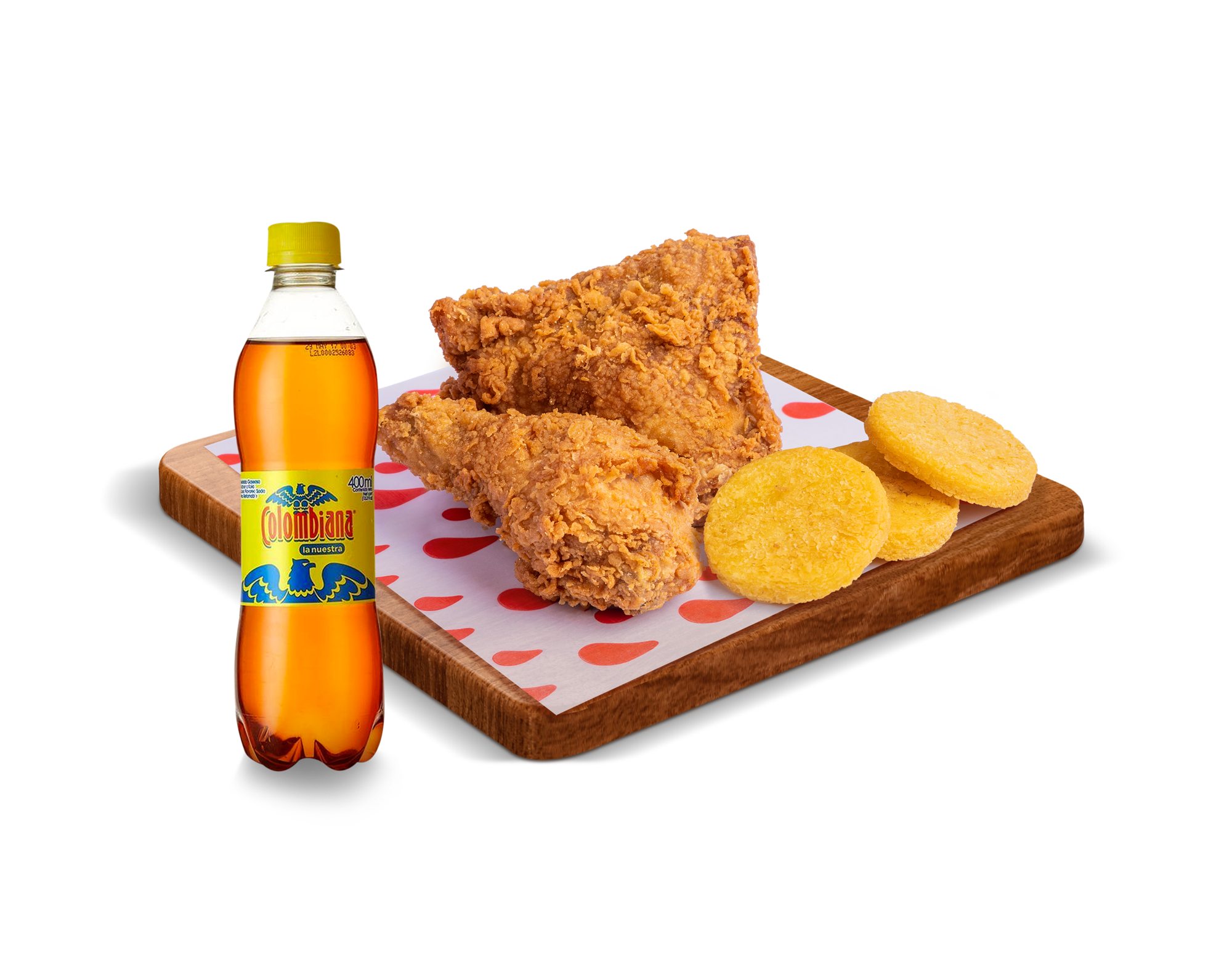 2 Presas broaster, 3 arepas, 1 gaseosa Postobón pet 400 ml (sabor a disponibilidad).