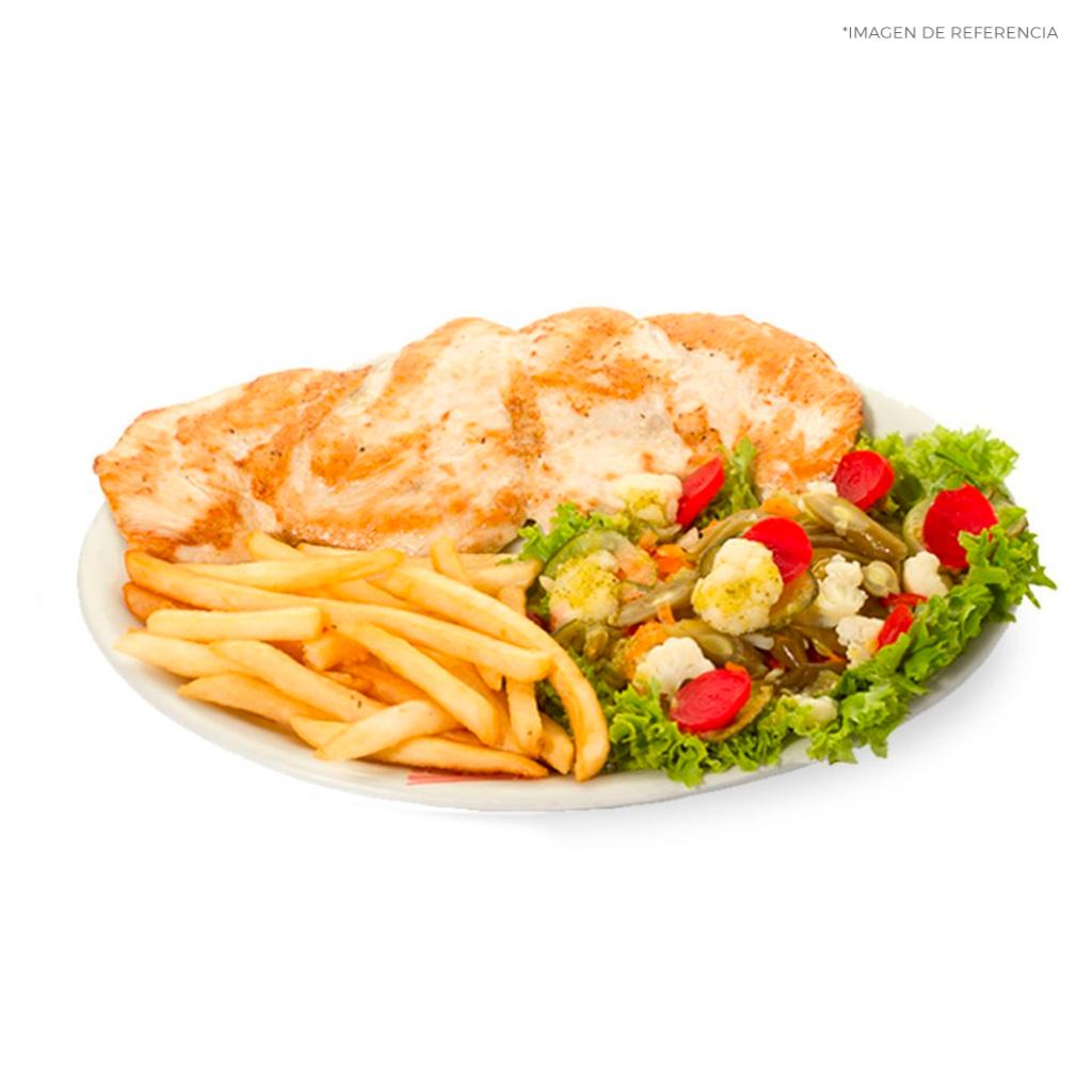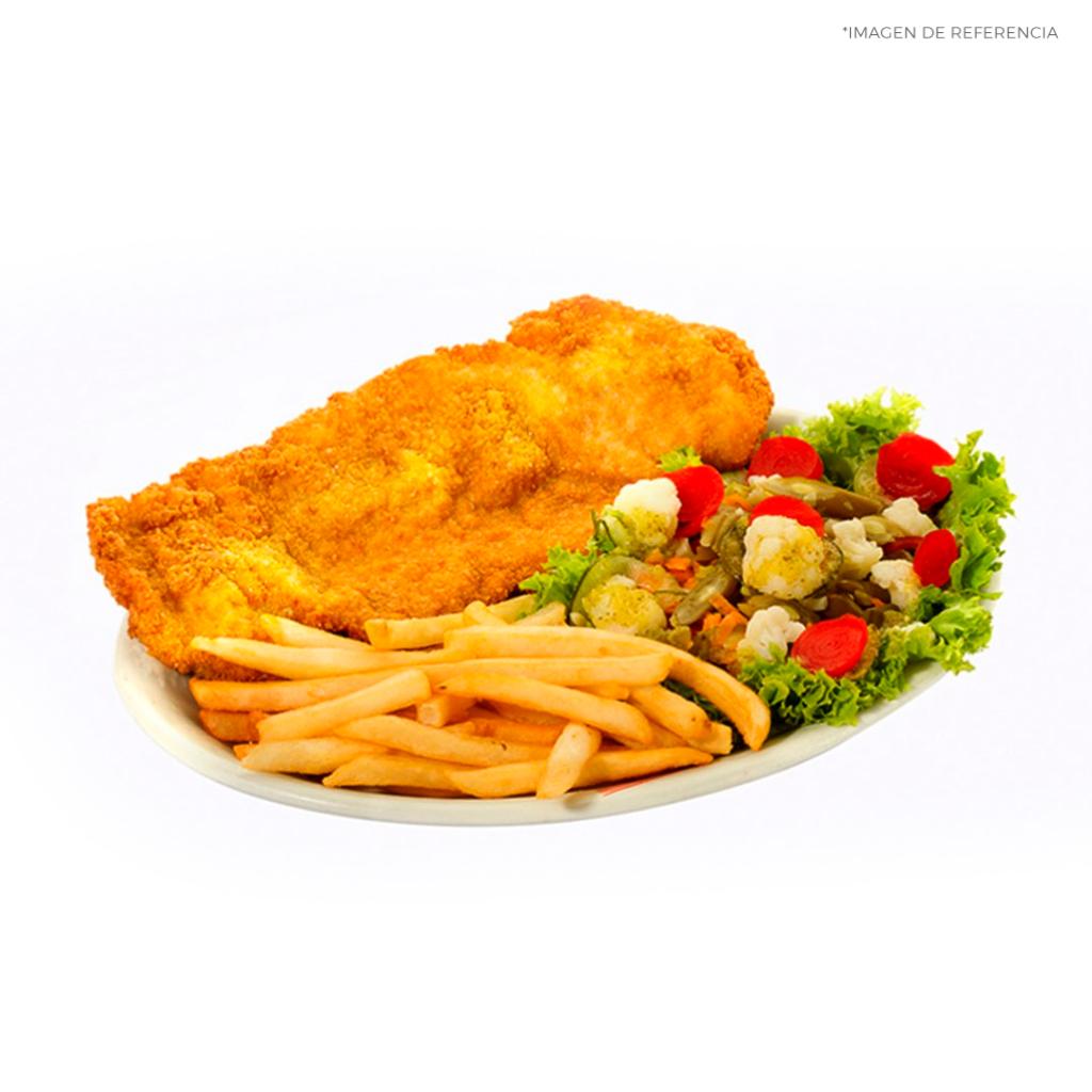 Disfruta de un delicioso filete de pechuga de 250 g apanada, acompañado con una porción de papa francesa.