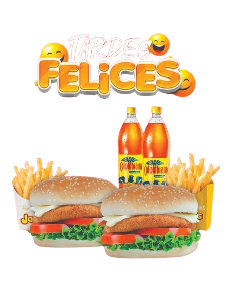 2 Hamburguesas de pollo jarri's acompañada de 2 papas a la francesa y 2 gaseosas Postobón 400 ml.