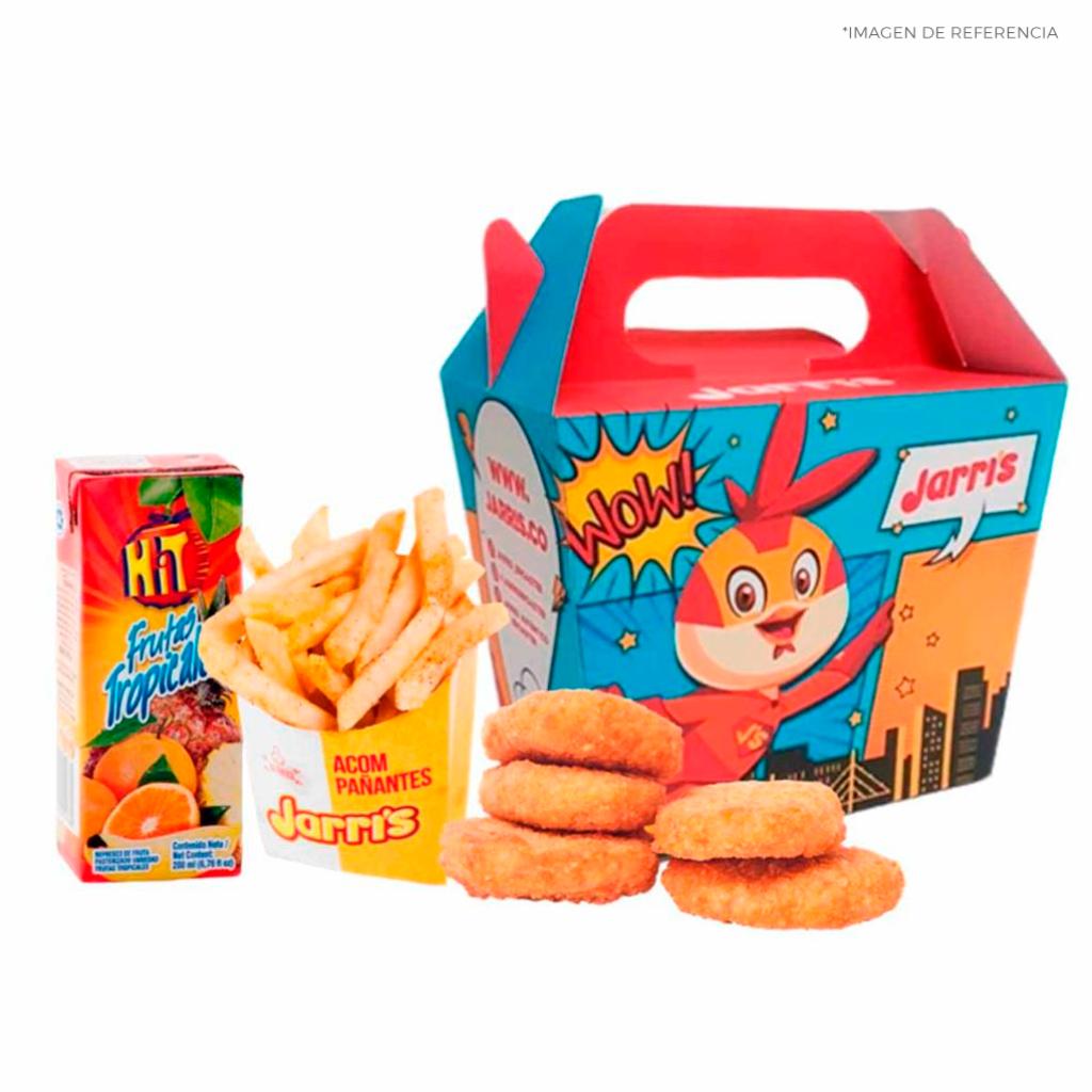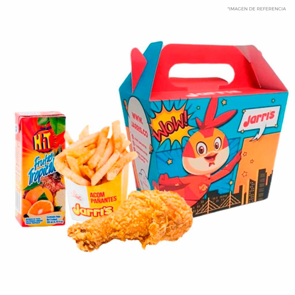El menú infantil ideal con deliciosos bocaditos de pollo jarri´s, papa francesa, jugo y sorpresa para alegrar a los más pequeños de la casa. 5 bocaditos de croquetas de pollo, acompañado con una porción de papa a la francesa, un jugo hit y una sorpresa, miel.