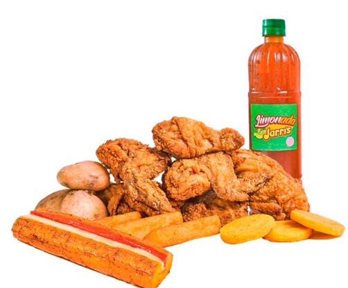 * 8 presas de pollo tradicional con papa, yuca frita y arepa * Gaseosa 1,5 L (sabor sujeto a disponibilidad) * 1 copa de la nueva salsa tártara Jarri’s 4 oz