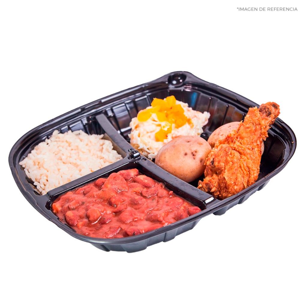 1 Porción de arroz, 1 porción de frijol con tocino, 1 ensalada Jarri´s pequeña, 2 arepas fritas y 1 pierna de pollo.