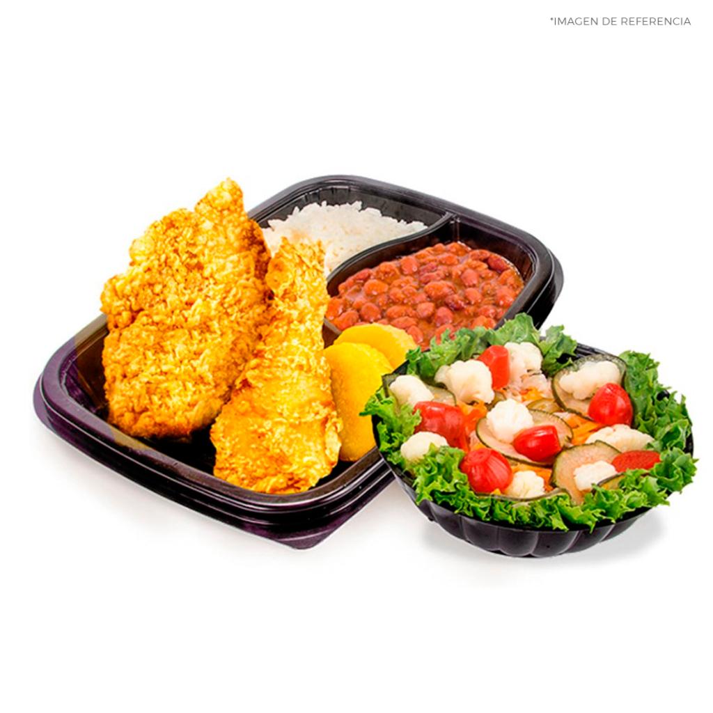 Un filete de pechuga apanado de 330 g, una porción de tu ensalada favorita (agridulce o jarri's) y porción de papa a la francesa.