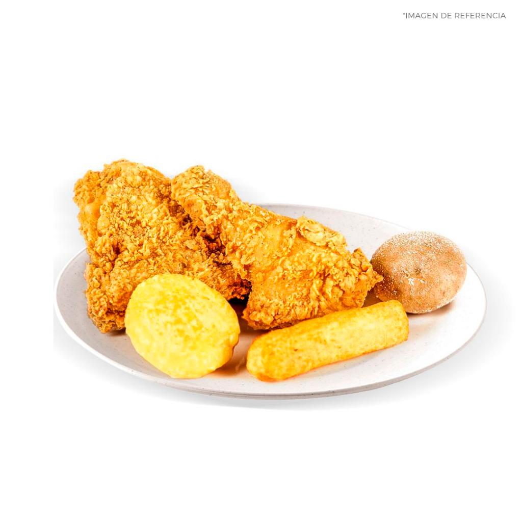 Disfruta de un delicioso filete de pechuga de 250 g apanada, acompañado con una porción de papa francesa.