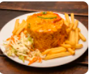Arroz con papas francesas, chorizo, cerdo, carne y pollo.