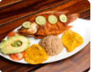 Tilapia menier acompañada de patacones, ensalada, arroz de coco y bebida 250 ml a elección.