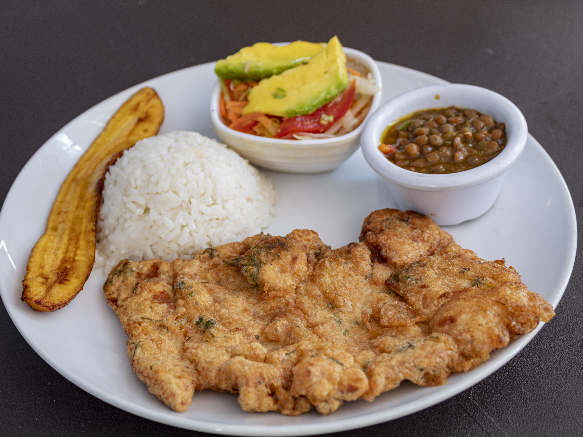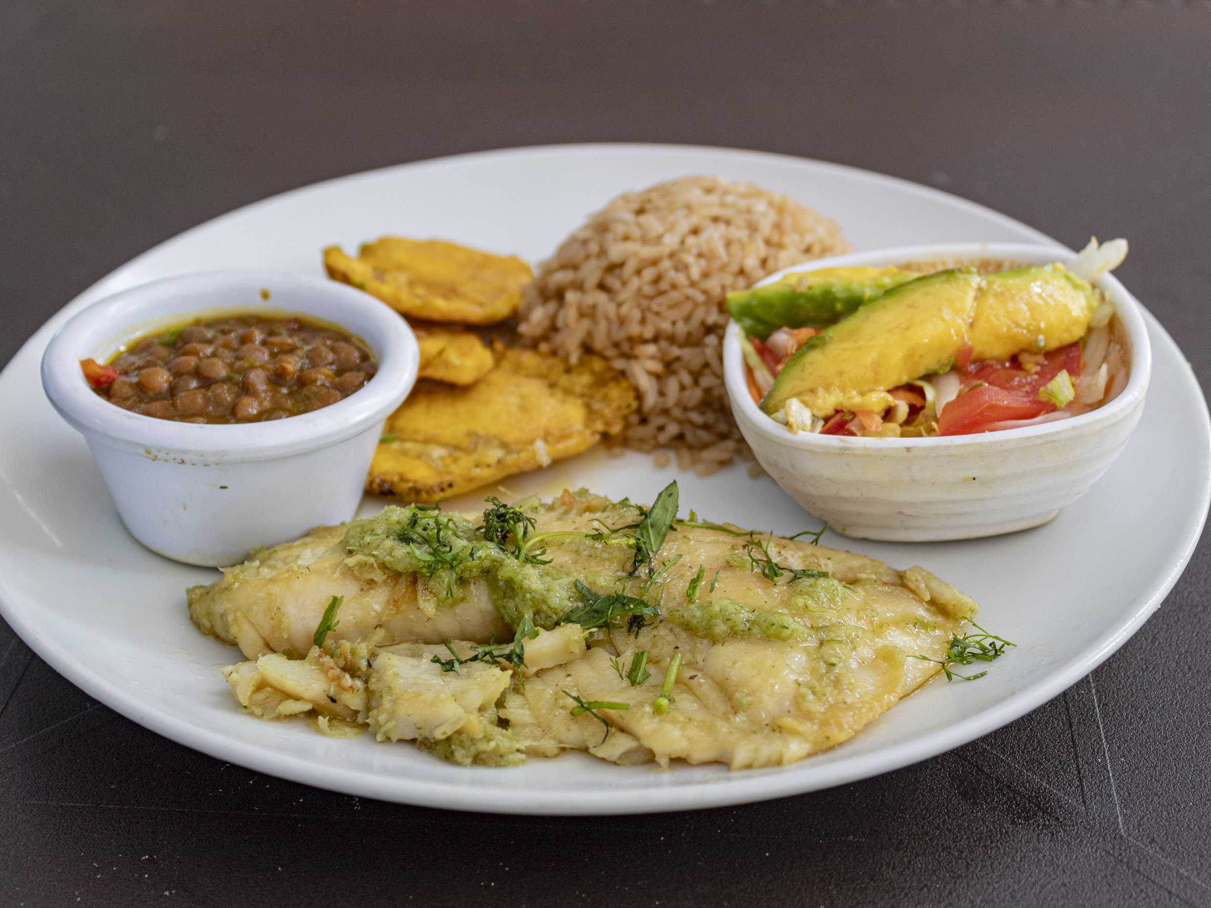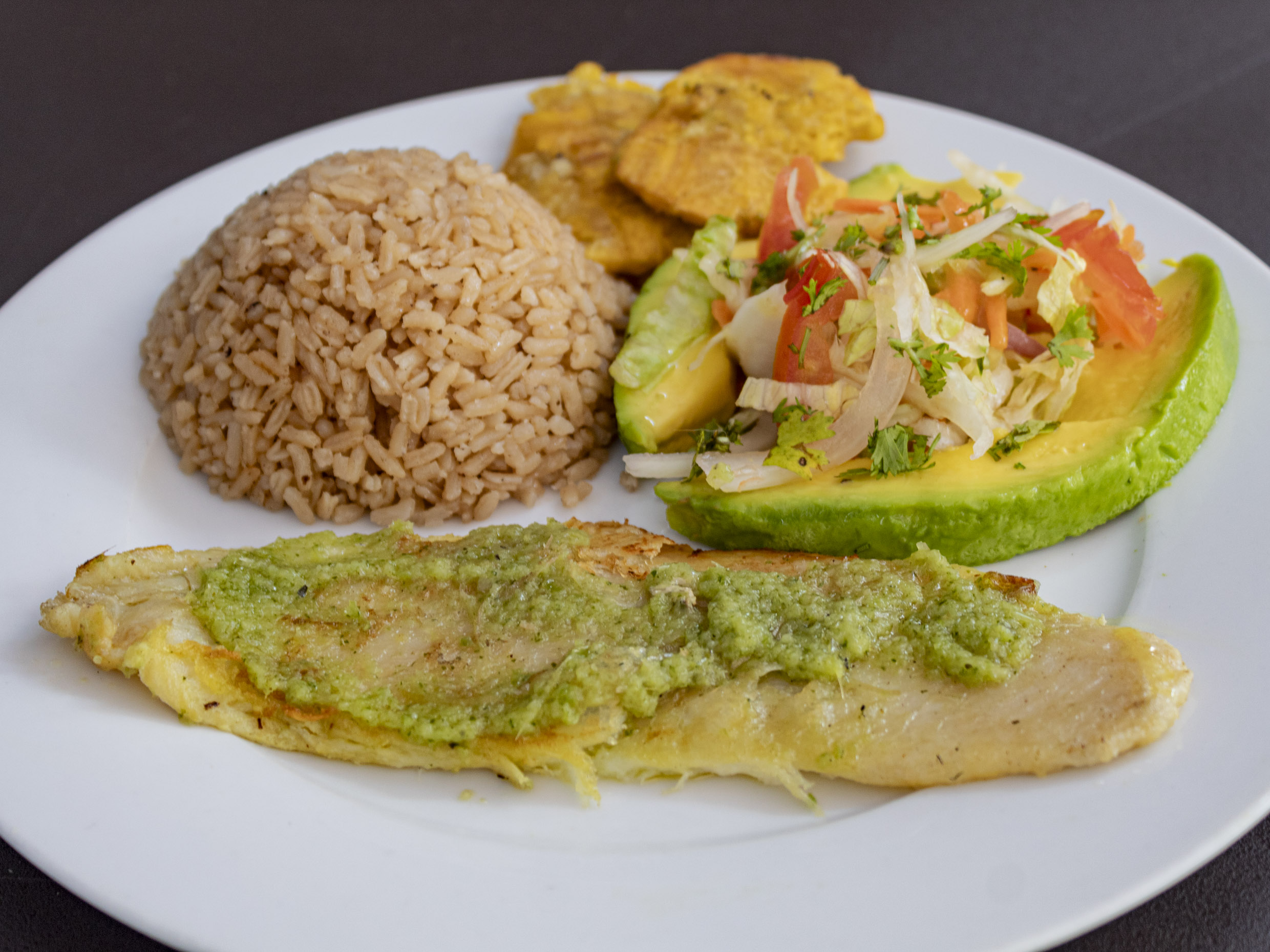 Tilapia a las finas hierbas acompañada de patacones, ensalada, arroz de coco y bebida 250 ml a elección.