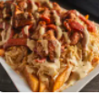 Salchipapa con cerdo 200 g, papas, salsa de la casa, queso costeño y chongo