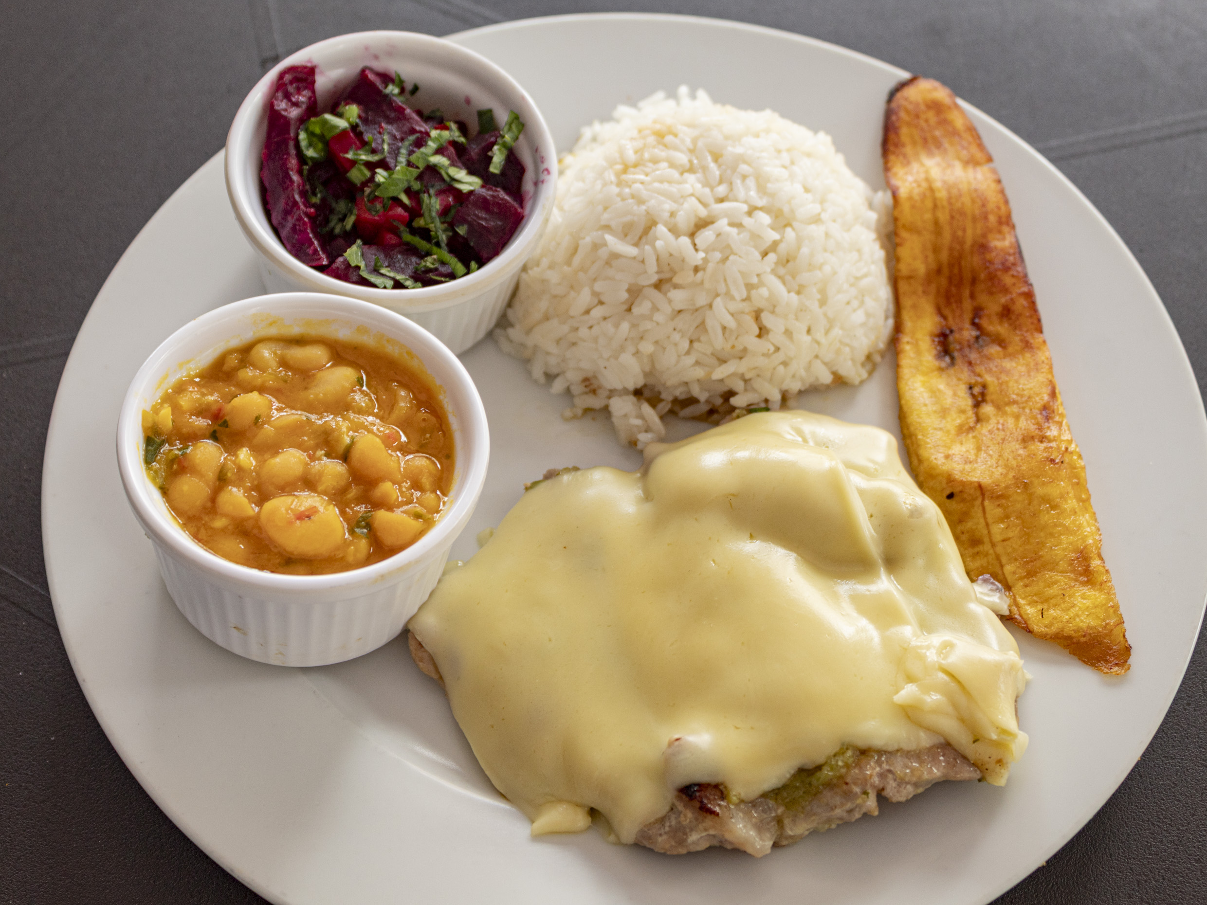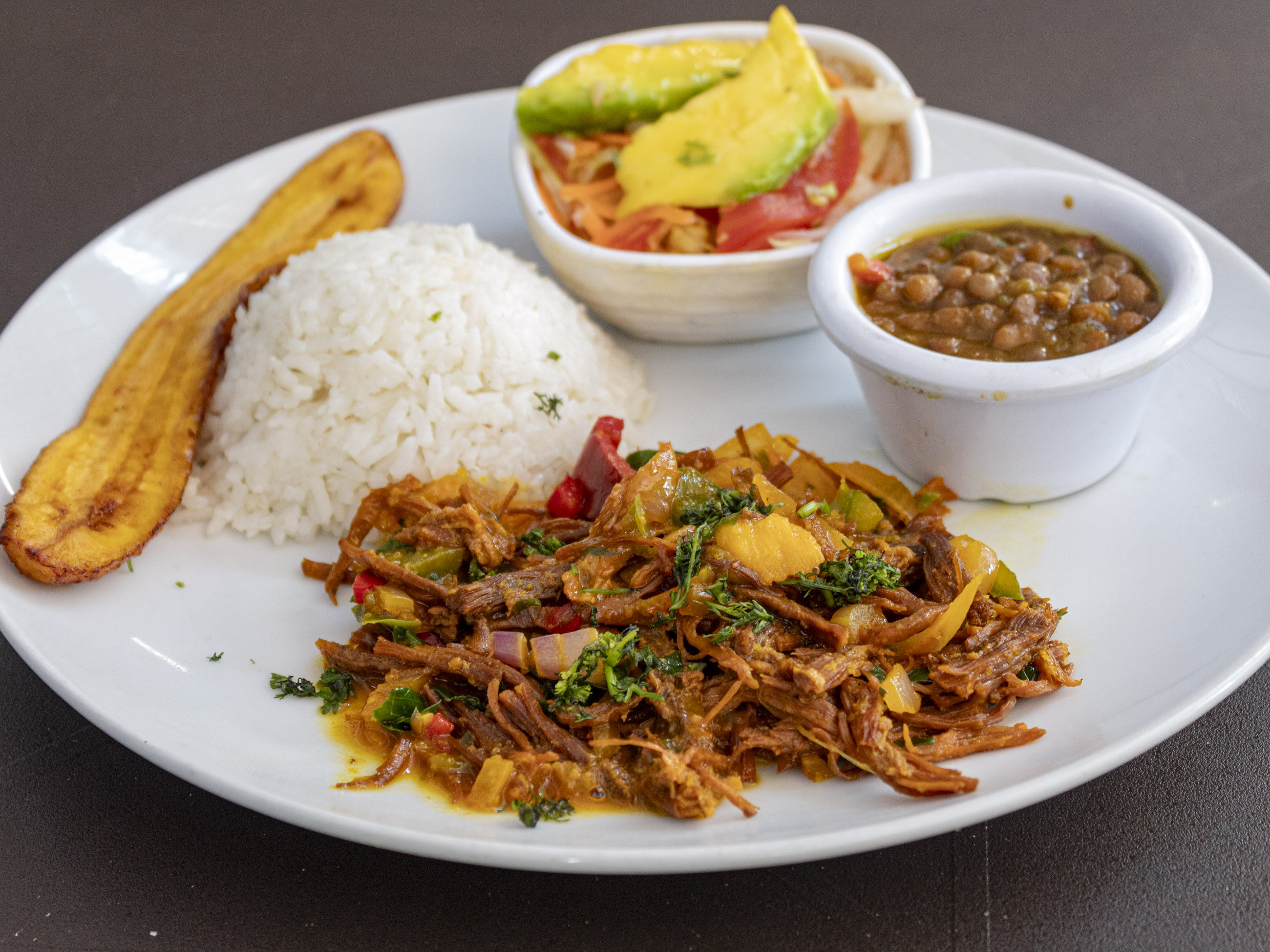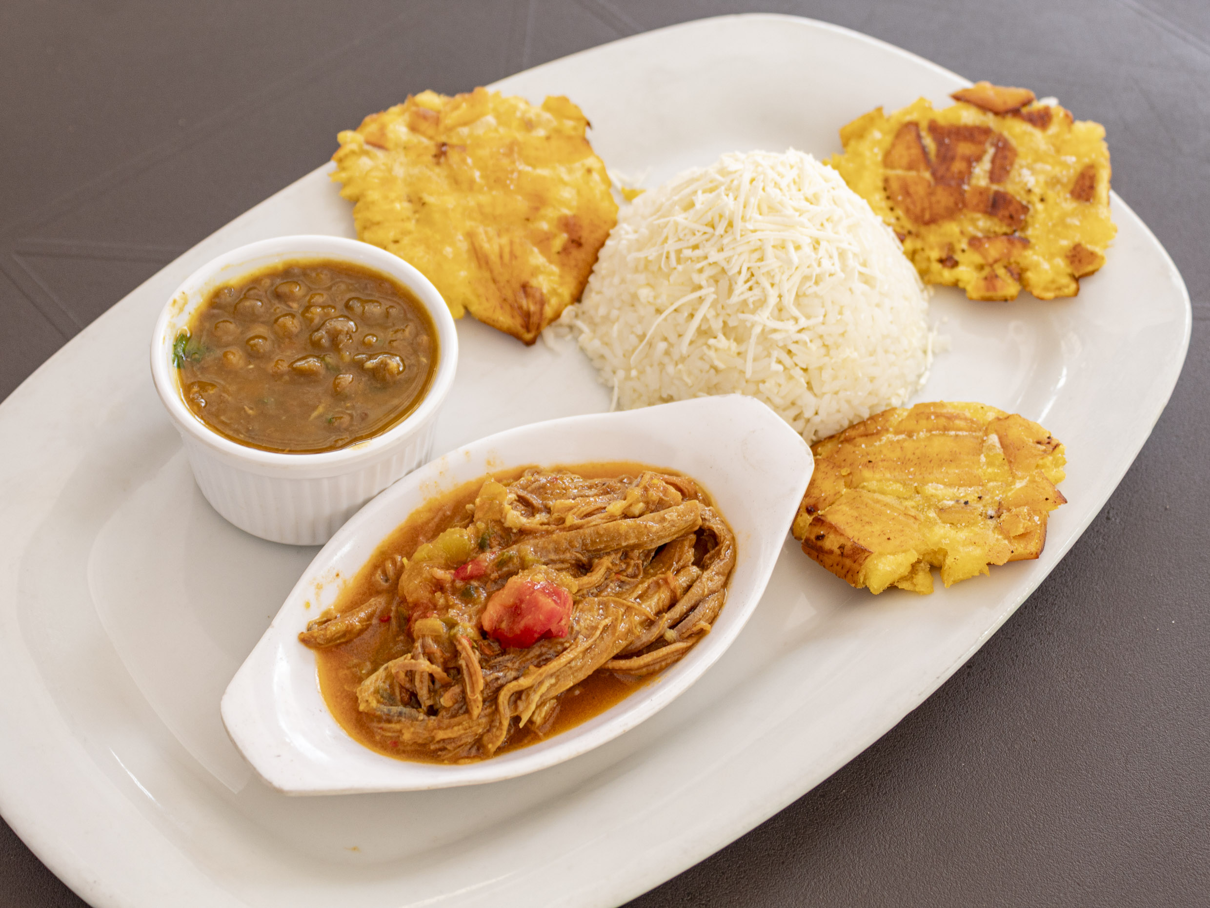 Arroz con queso, carne desmechada, lentejas y patacón.