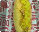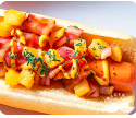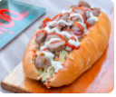 Perro caliente con pan, chongo, queso costeño, salsa de la casa con salchicha Suiza, jamón, piña en trocitos y mozzarella.
