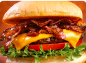 Hamburguesa con pan artellano, 300 g de carne, tomate, cebolla, jamón, tocineta, salsas de tomate y mostaza.