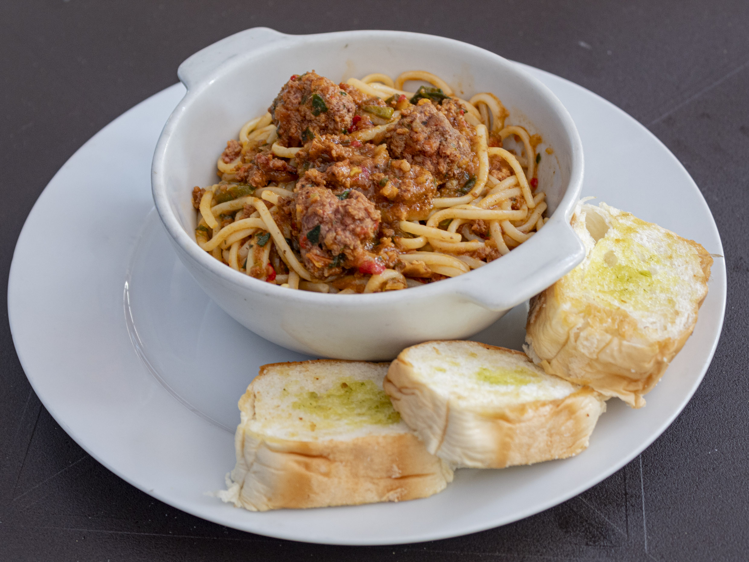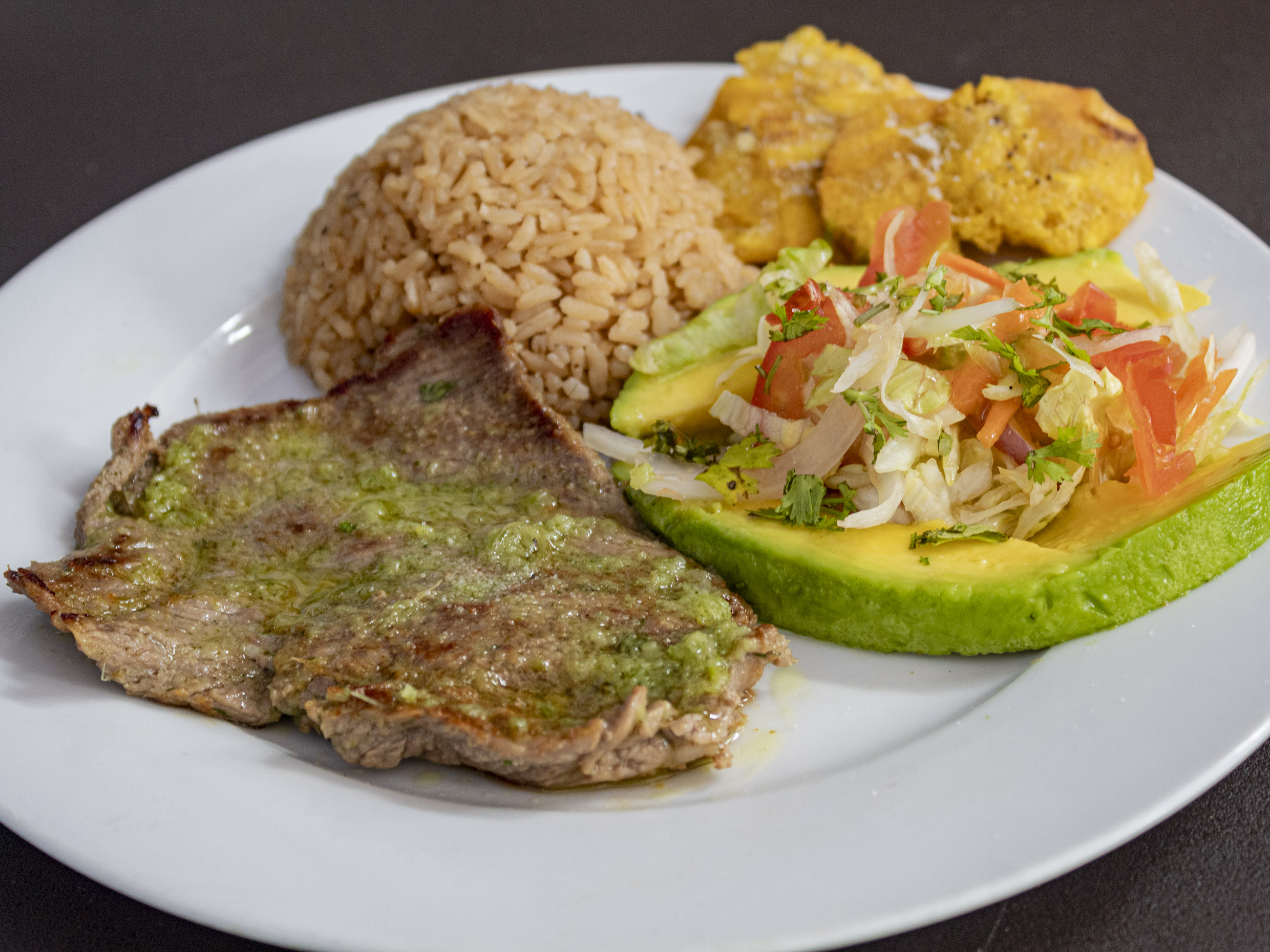 Sobrebarriga 150 g acompañada de arroz, granos, ensalada del día y sopa de pollo de la casa.