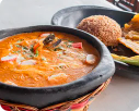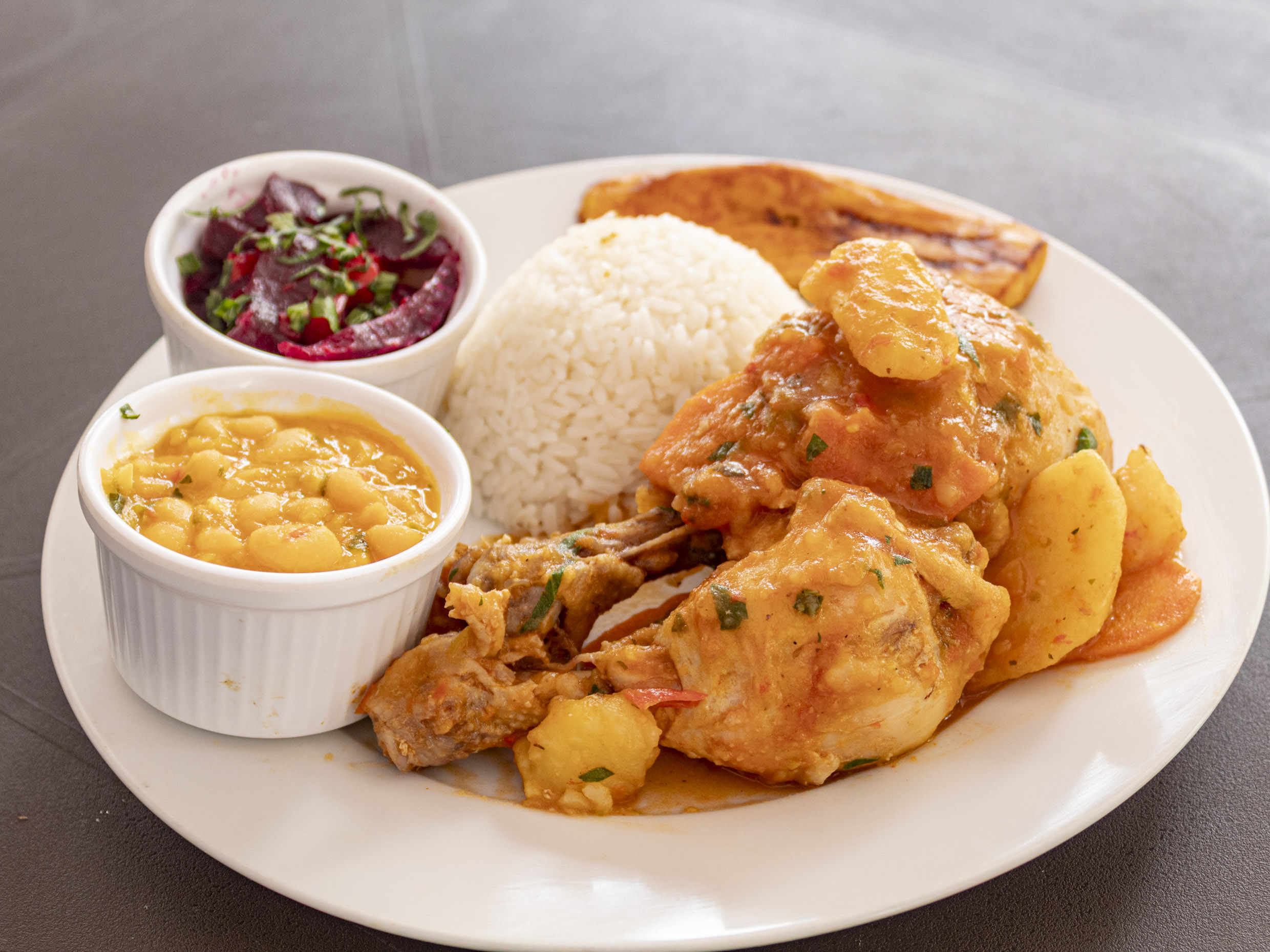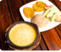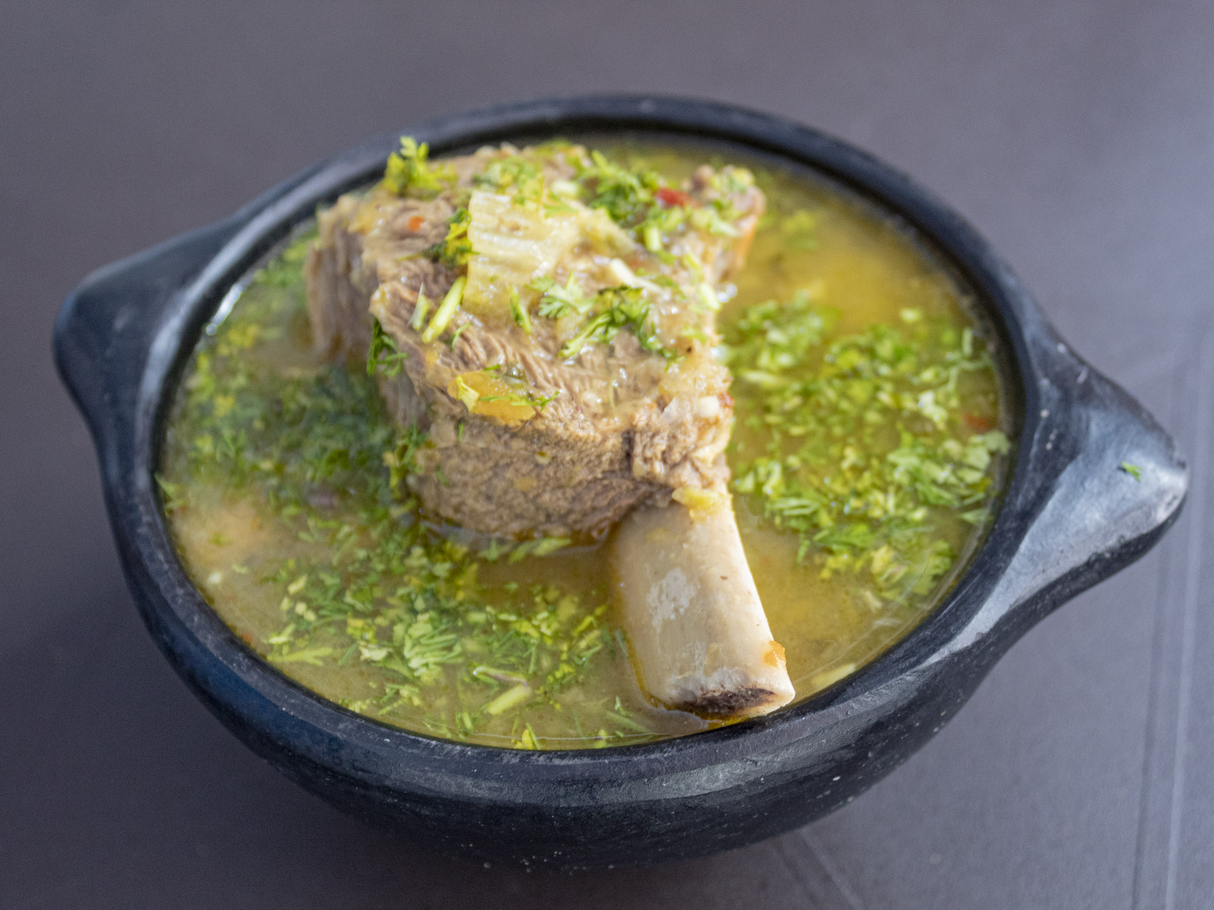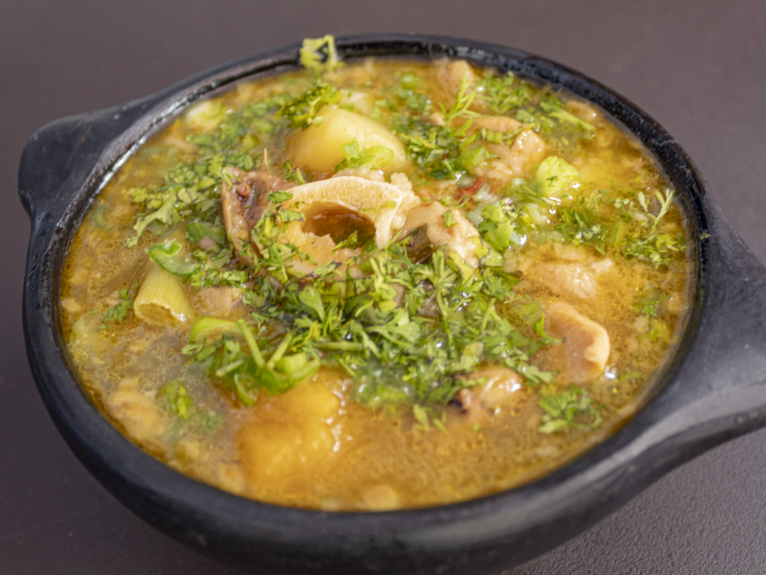 Sancocho de mondongo de 32 onzas, una porción de arroz, una torreja de aguacate.
