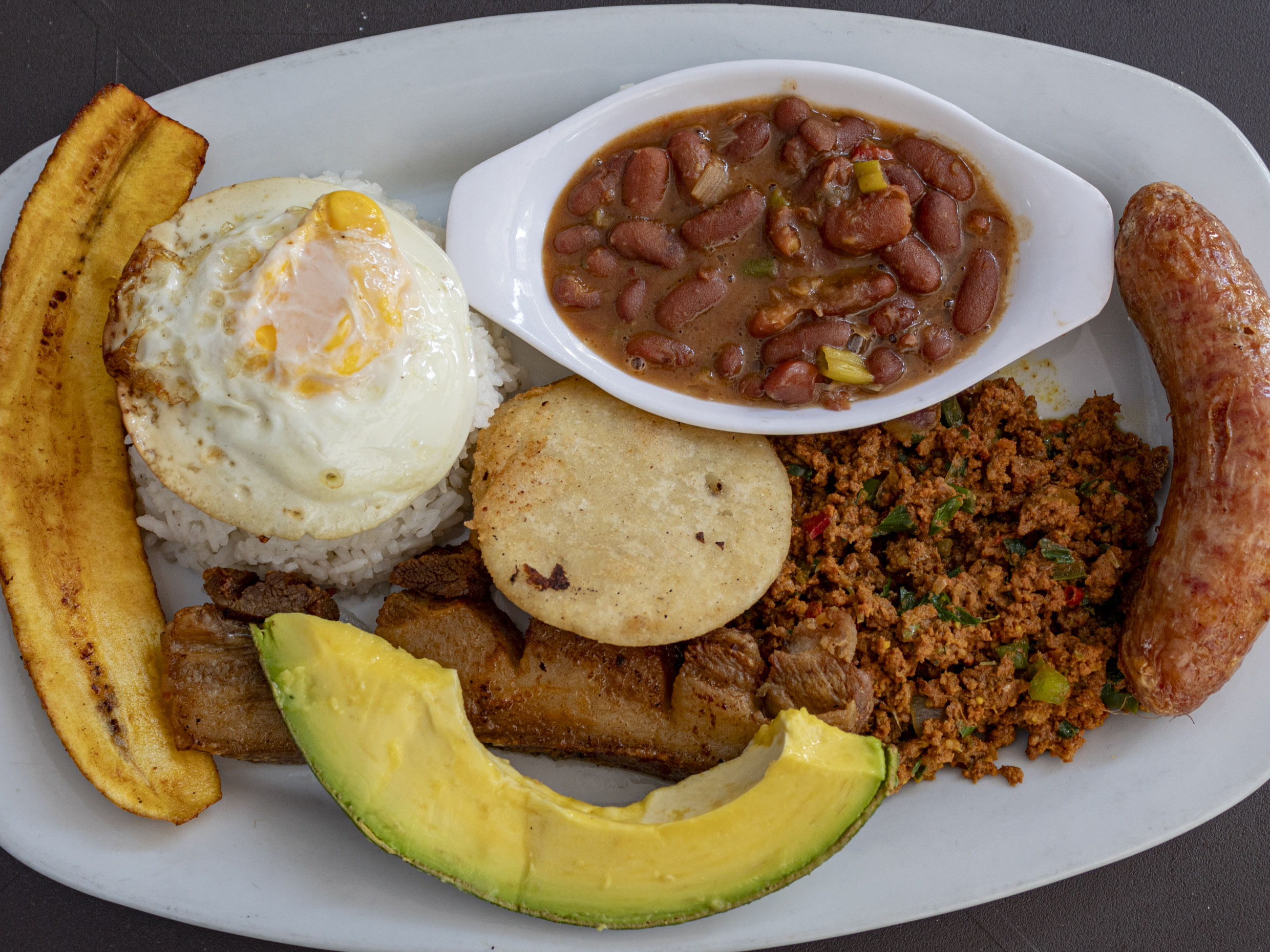 arroz de coco, granos, ensalada de vegetales,patacones y sopa