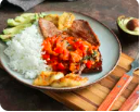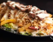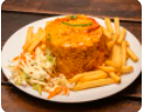 Arroz con papas francesas y ensalada, chorizo, carne, pollo, camarón y cerdo.