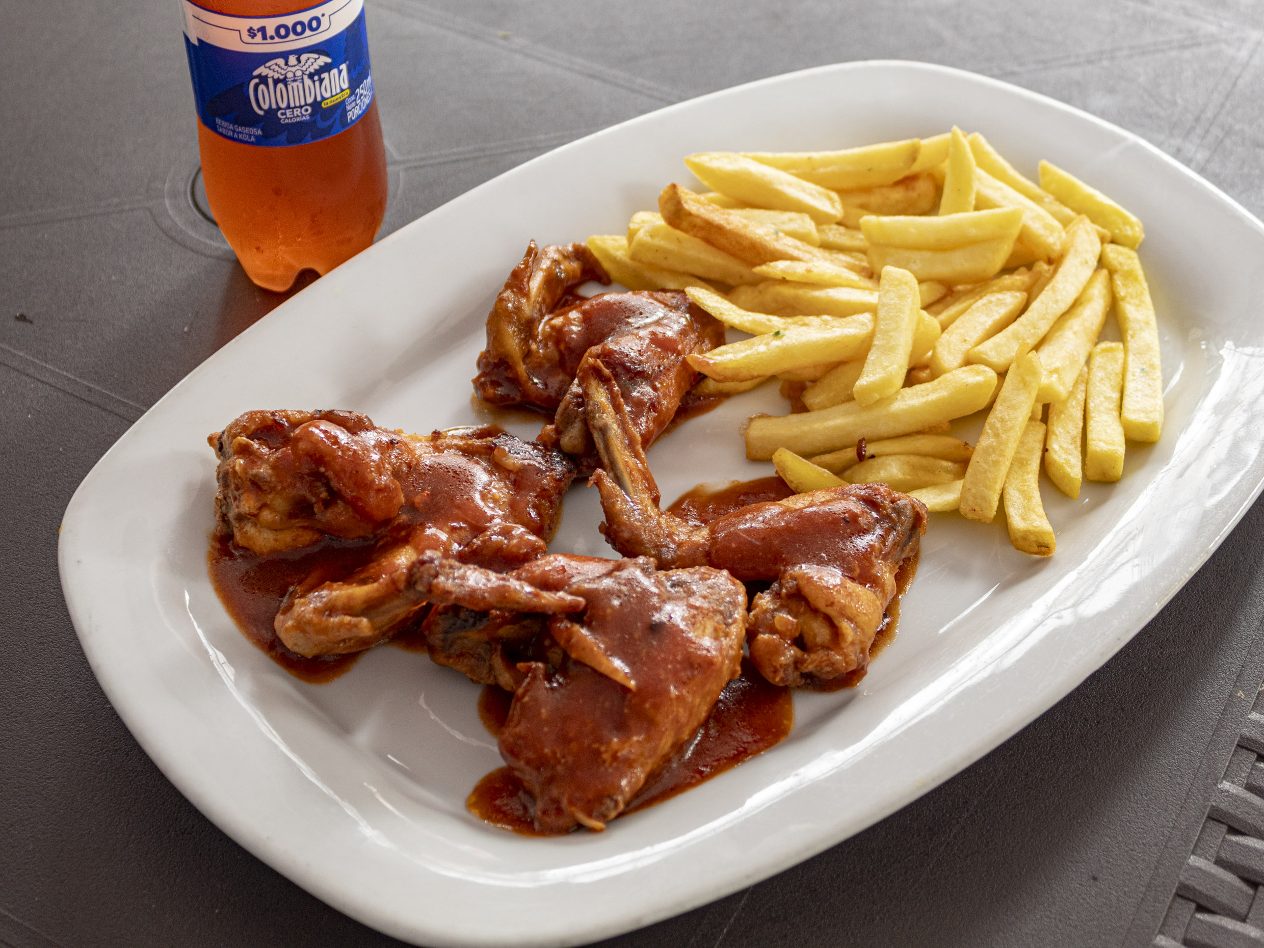Costillas de cerdo 500 g con salsa BBQ y con papa a la francesa.
