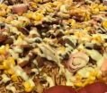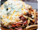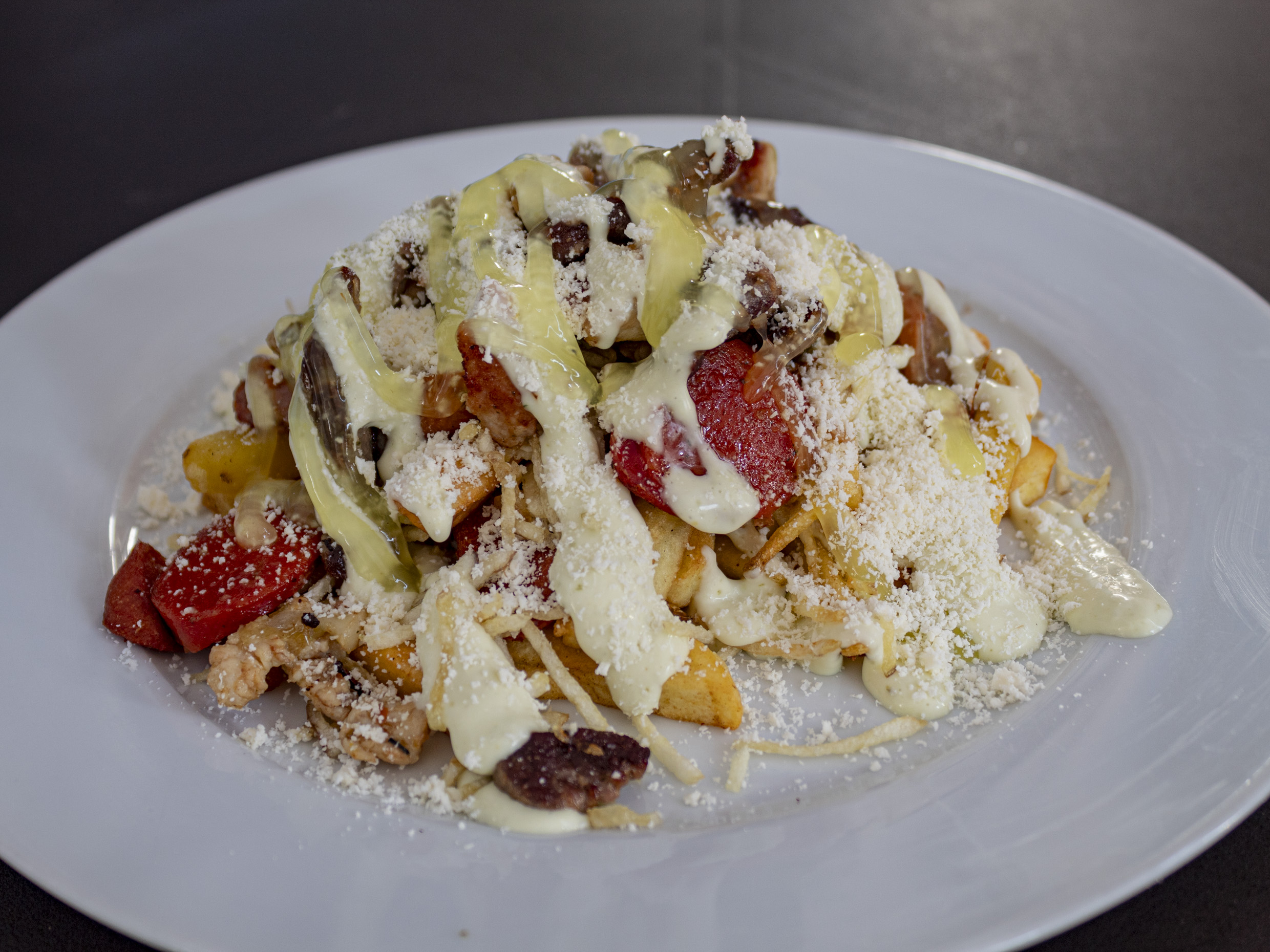 Salchipapa con papas delichi, 200 g de carne, chongo y queso costeño.