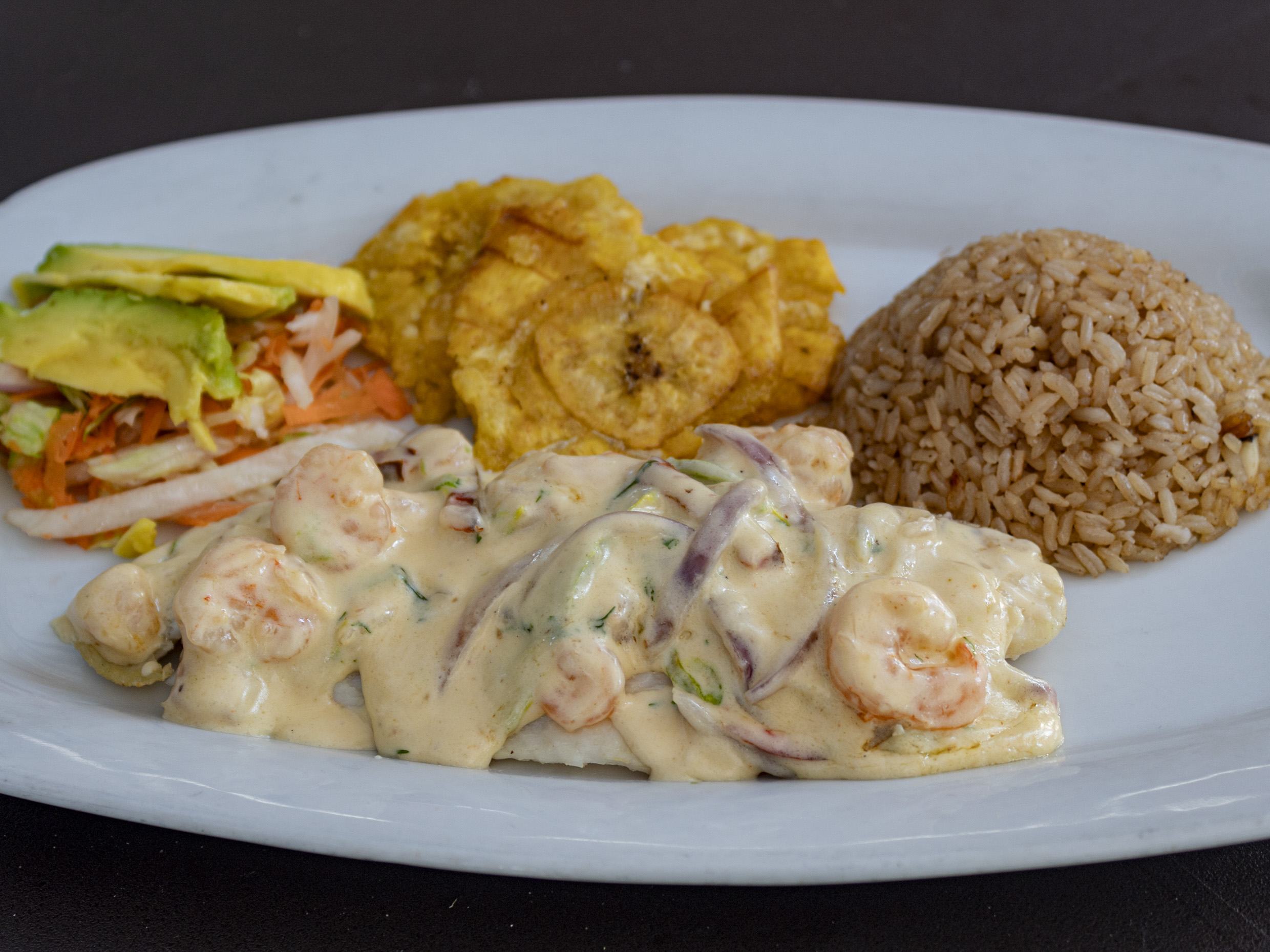 Róbalo en salsa de camarones con patacones, arroz de coco y ensalada de aguacate.