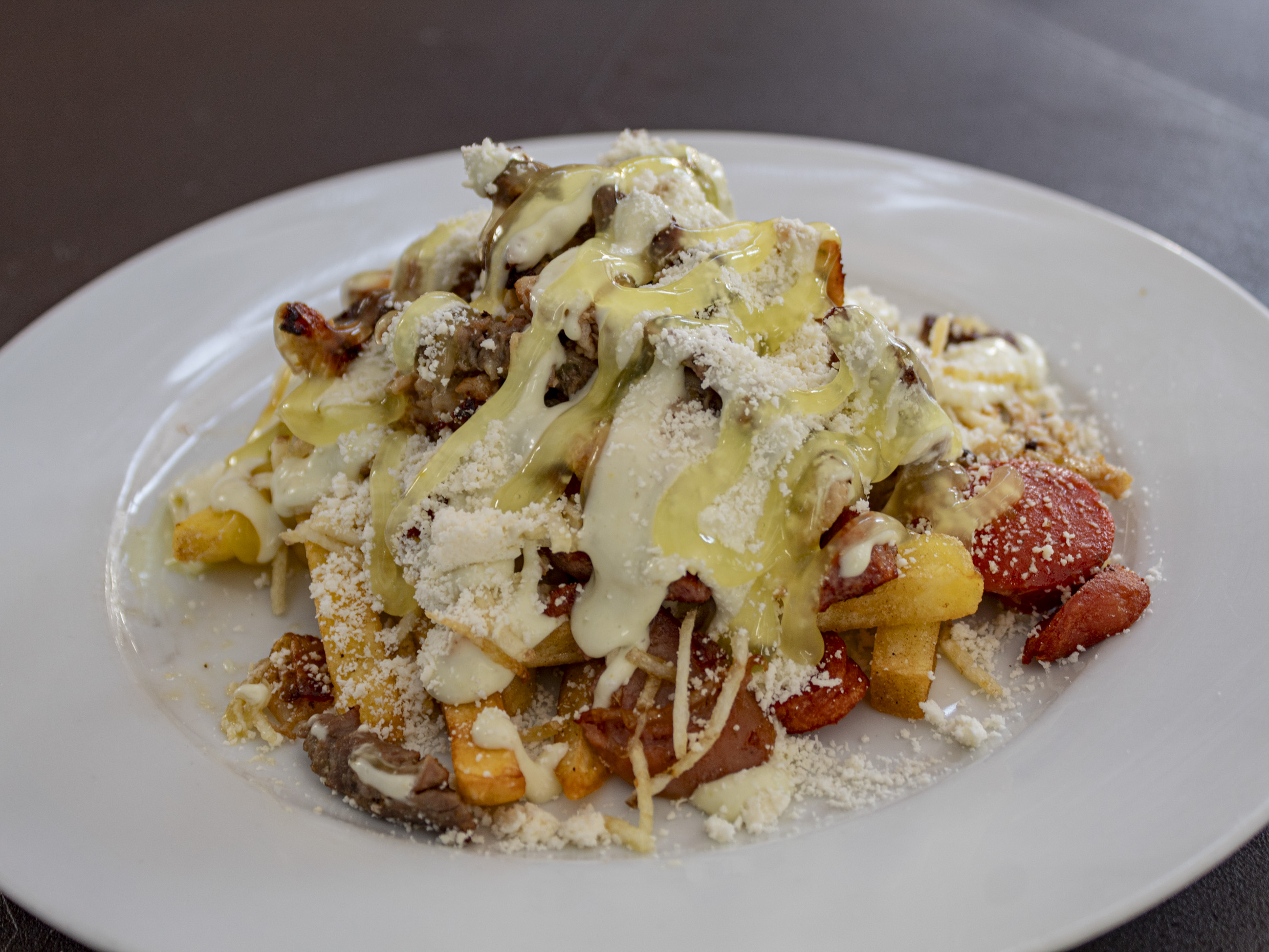 Salchipapa con carne, pollo y cerdo 100 g cada uno, chorizo, butifarra con .