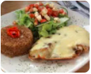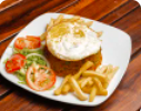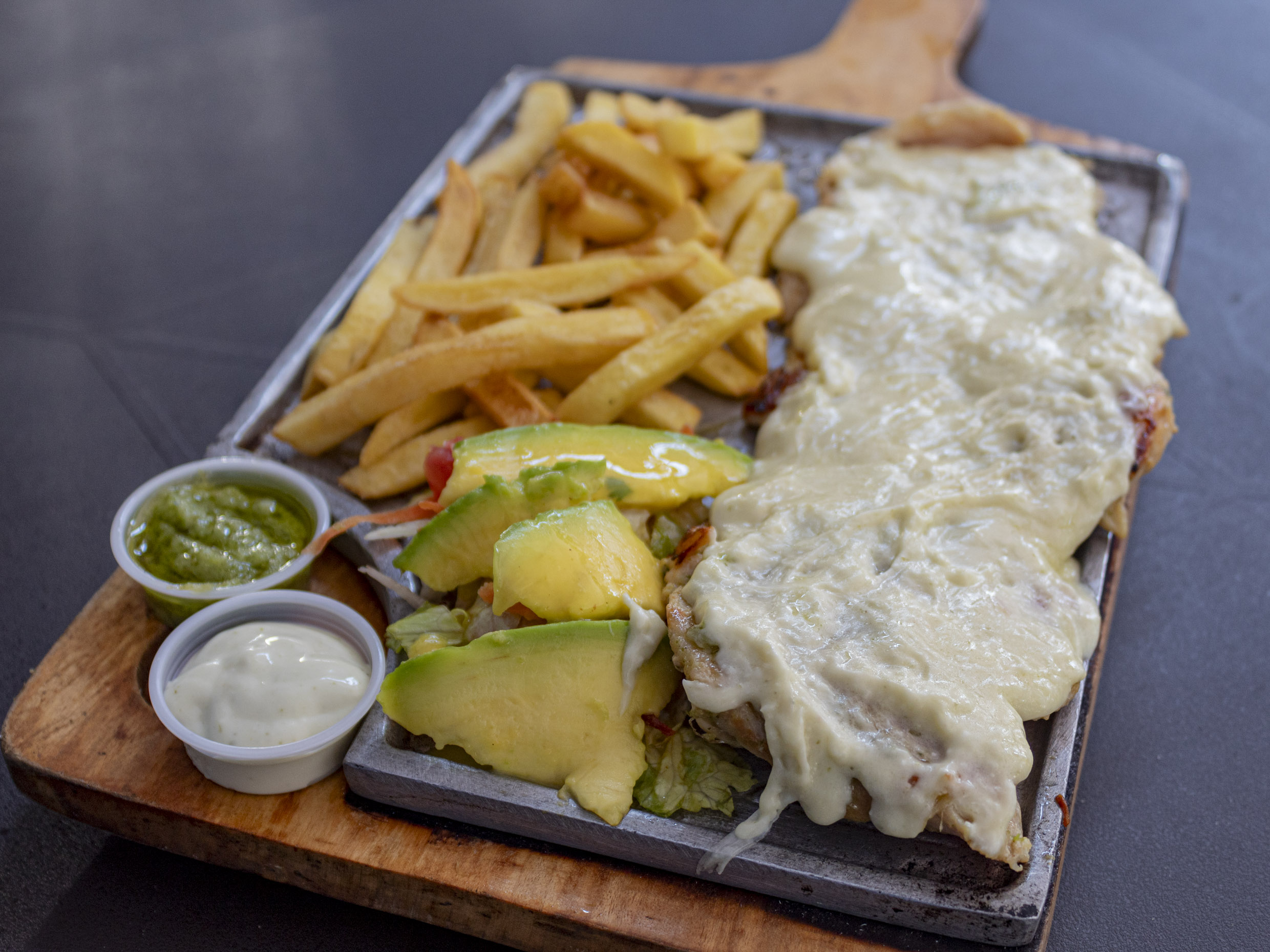 Pechuga 360 g con jamón, queso mozzarella y papas francesa.