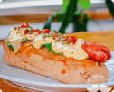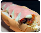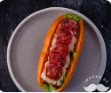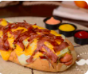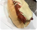 Perro caliente con pan, chongo, queso costeño, salsa de la casa con salchicha suiza, jamón y mozzarella.