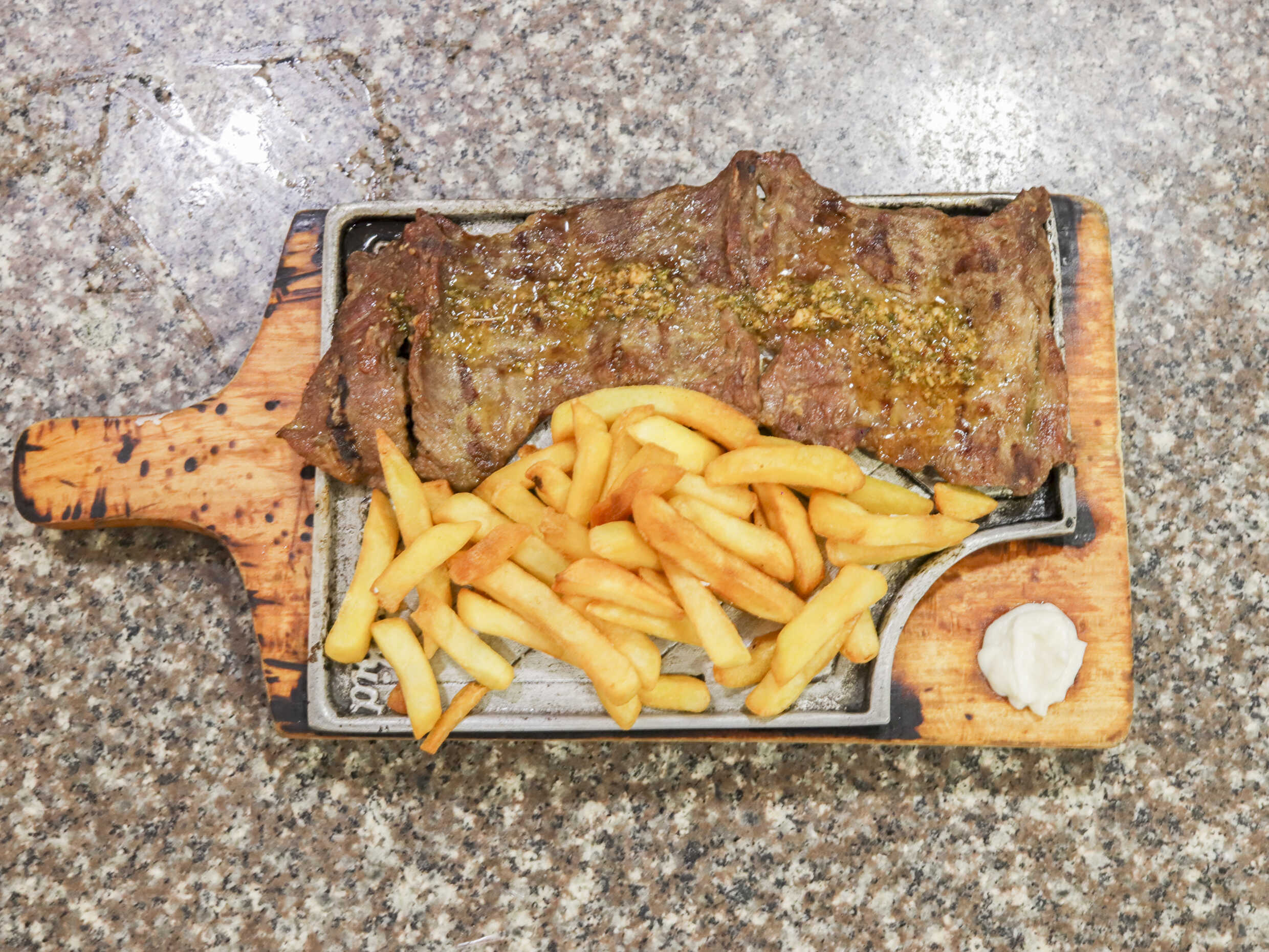Sobrebarriga 360 g con papa, bollo y salsa de ajo.