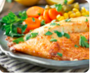 Tilapia gratinada acompañada de patacones, ensalada, arroz de coco y bebida 250 ml a elección.