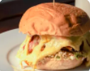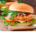 Hamburguesa con pan artellano, 150 g de pollo, tomate, cebolla, salsas de tomate y mostaza.