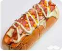 Perro caliente con pan, chongo, queso costeño, salsa de la casa, salchicha, mozzarella y jamón.