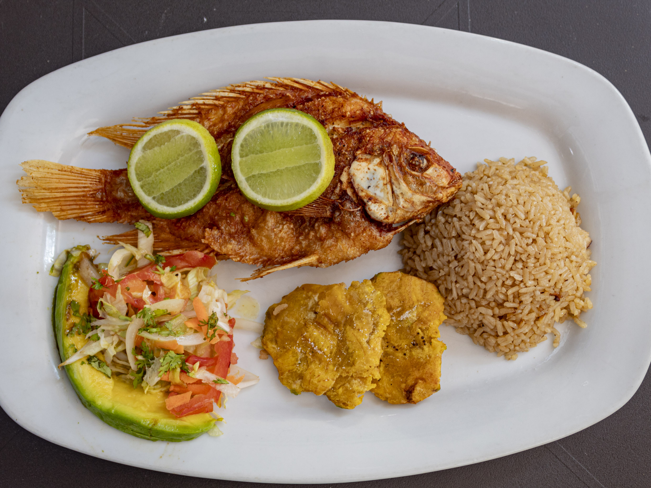 Róbalo a la marinera con mariscos, patacones y arroz de coco.
