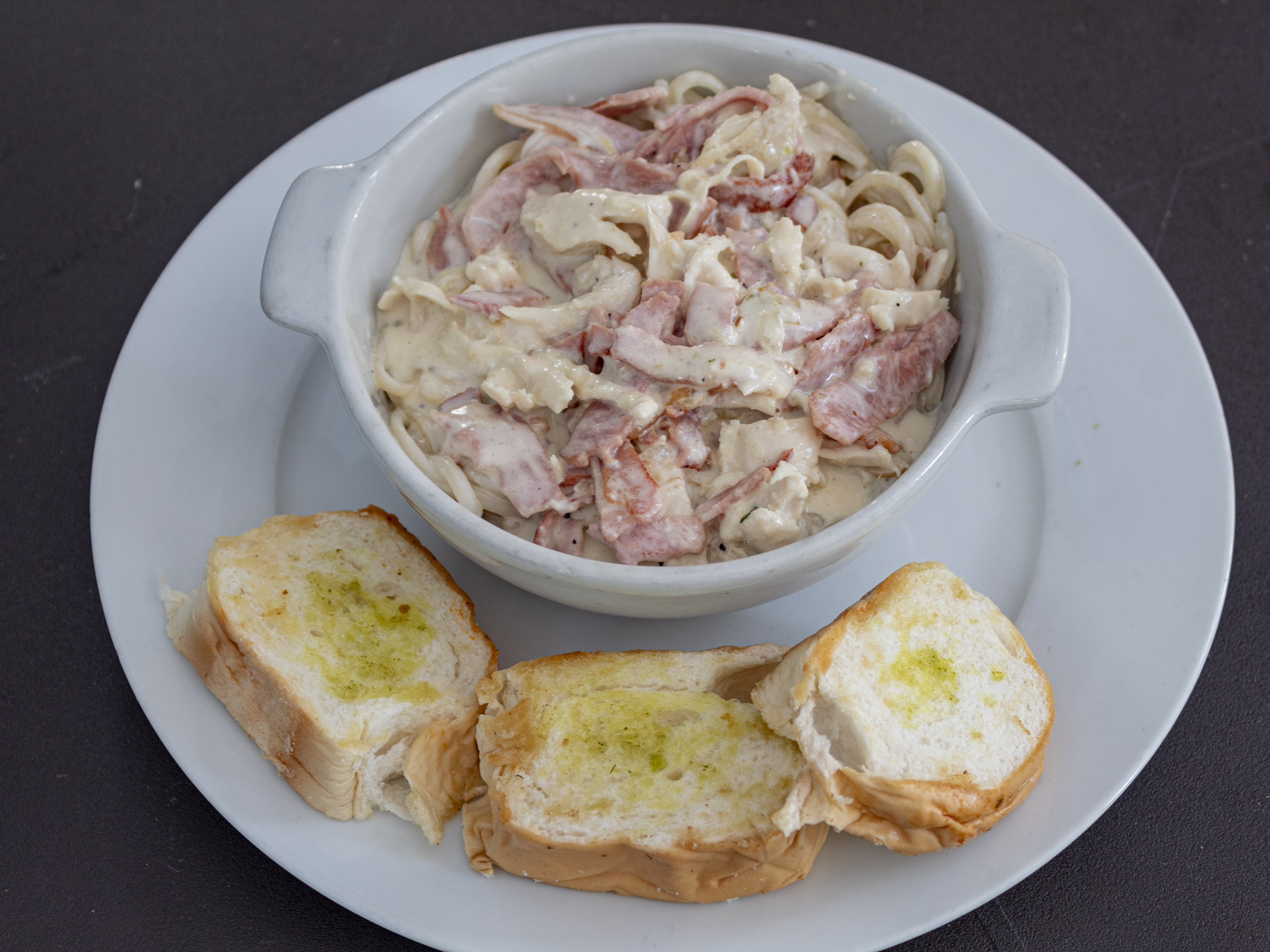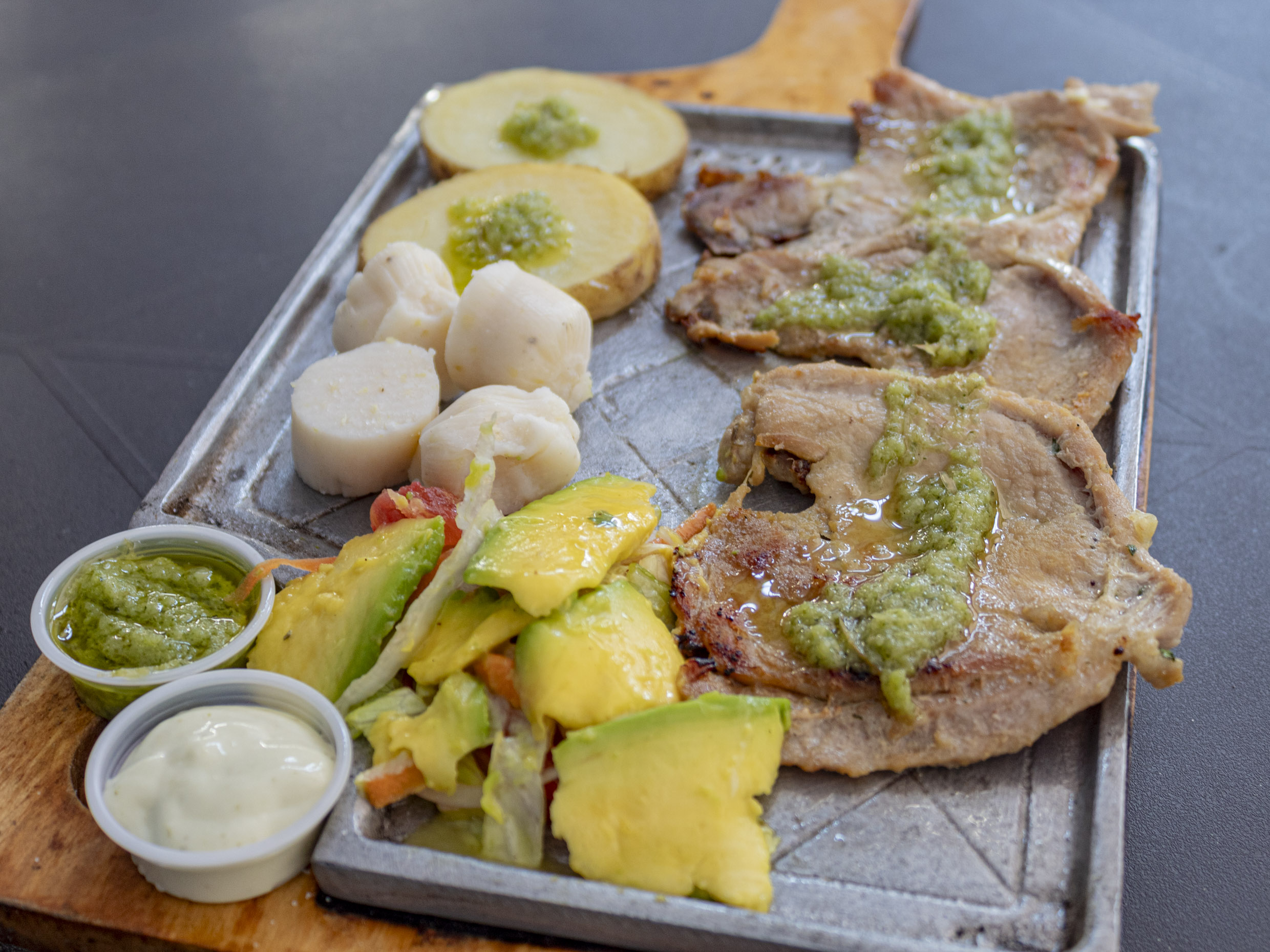 Lomo de cerdo 360 g con papa al vapor, bollo y salsa de ajo.