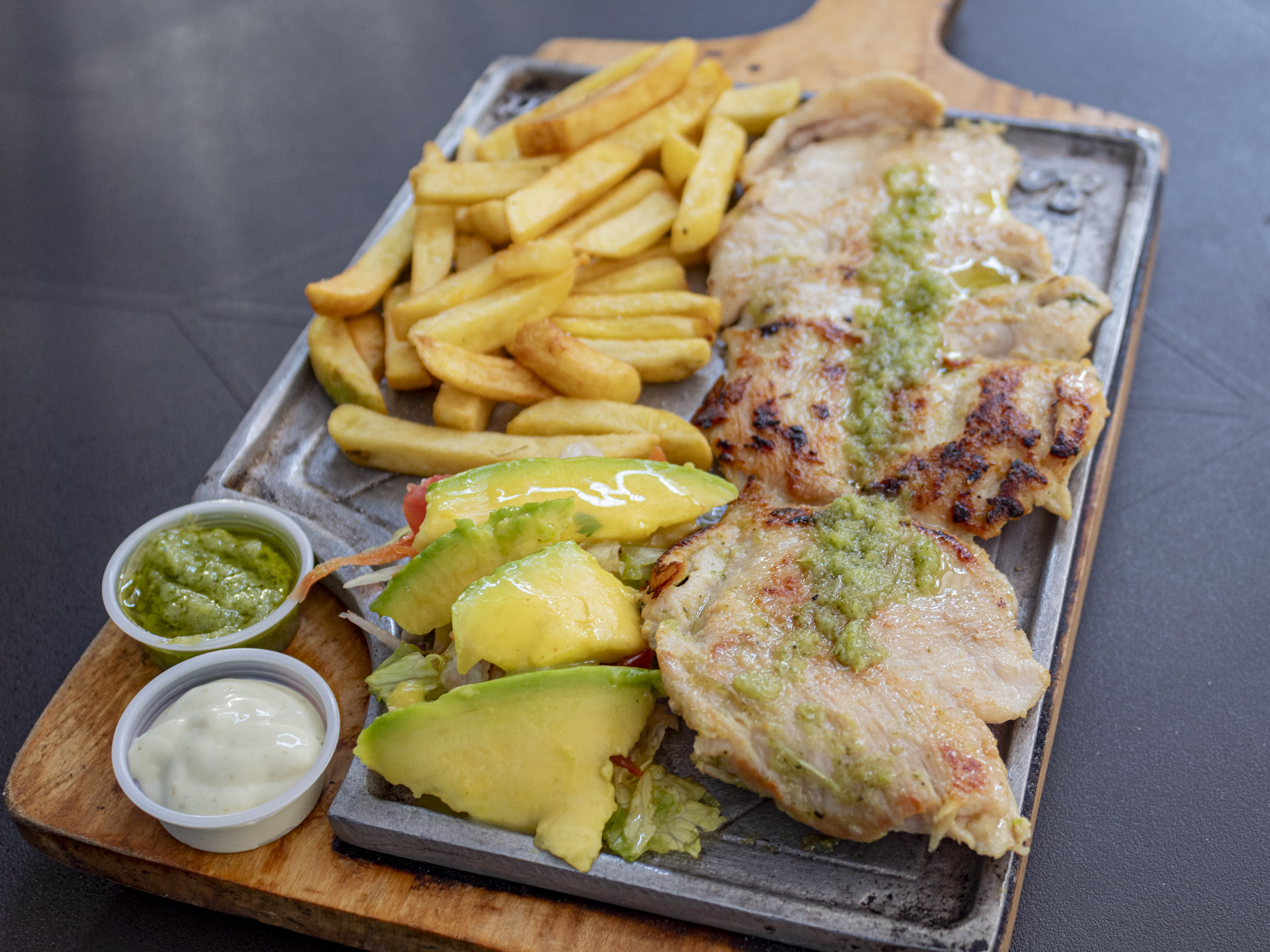 Pechuga 360 g con papa francesa y salsa de ajo.