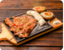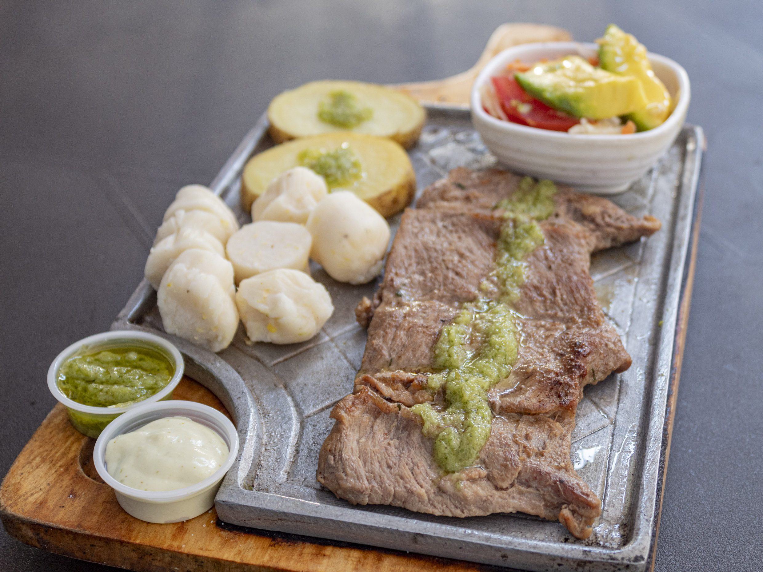 Churrasco lomo ancho 360 g con papa al vapor y bollo salsa de ajo.