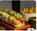 Perro caliente con pan, chongo, queso costeño, salchicha alemana, salsas de la casa y mexicana.