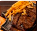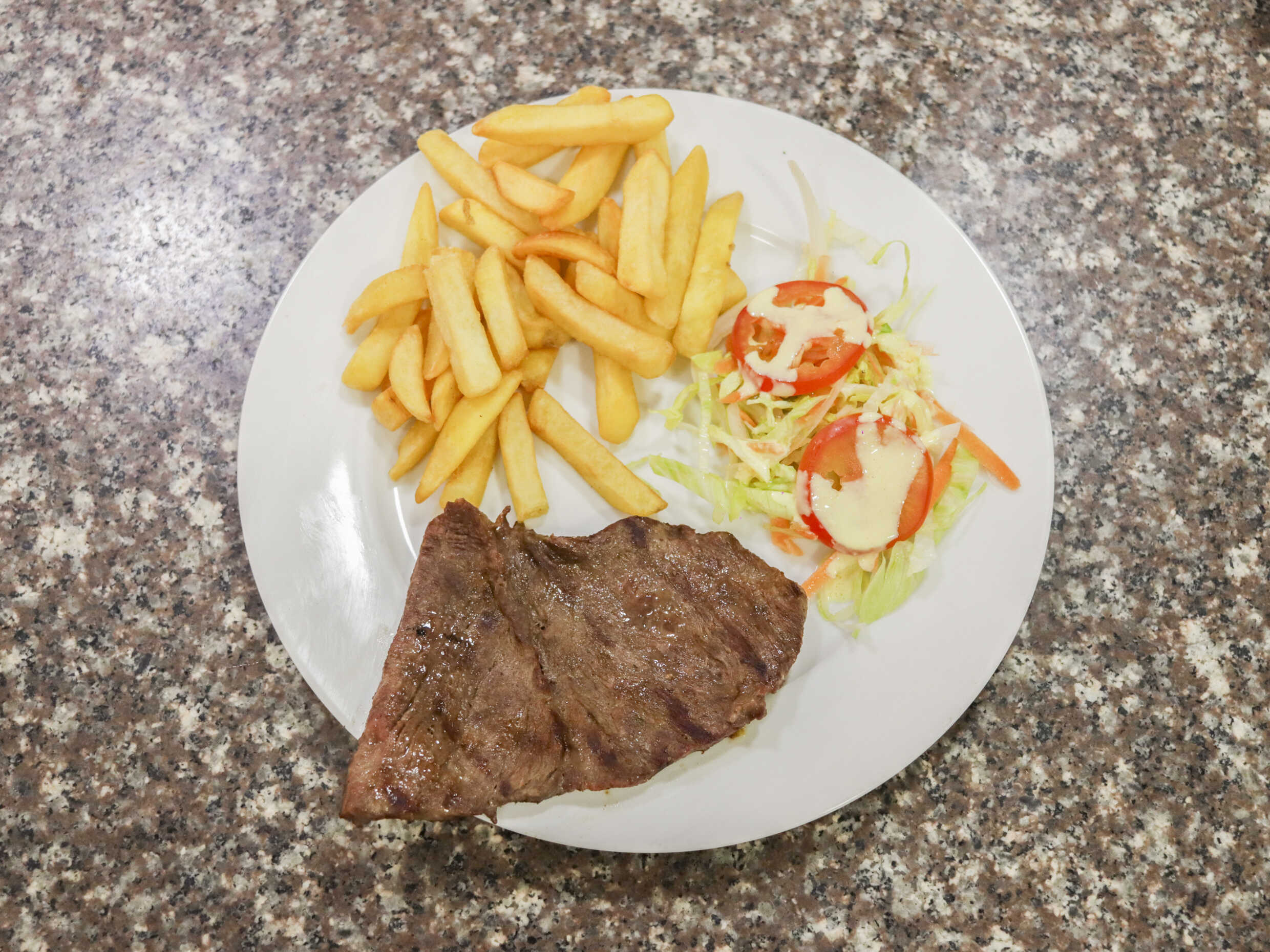 Lomo fino 400 g acompañado con papa francesa, ensalada y salsa de ajo.