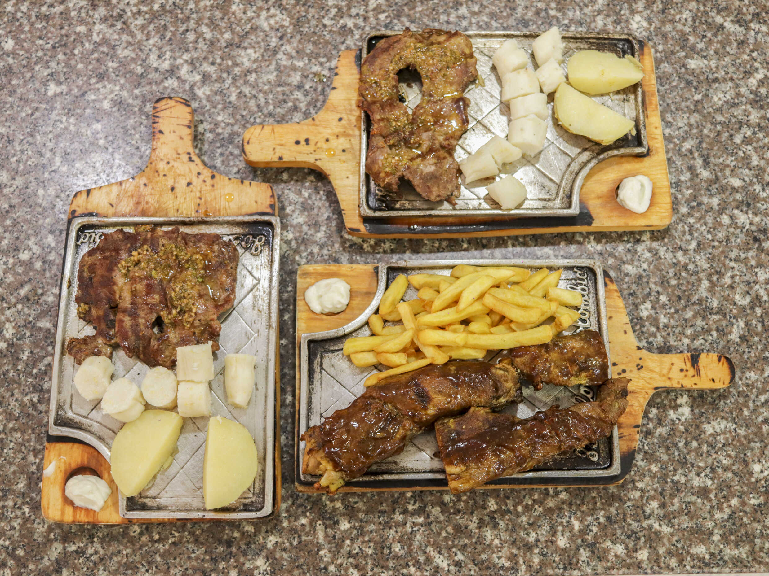 Medio pollo Árabe, lomo de cerdo y churrasco 300 g cada uno, 6 chorizos, 6 butifarras con papas Francesa y papa al vapor.
