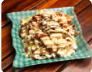 Salchipapa con papas delichi, 200 g de pollo, chongo y queso costeño.
