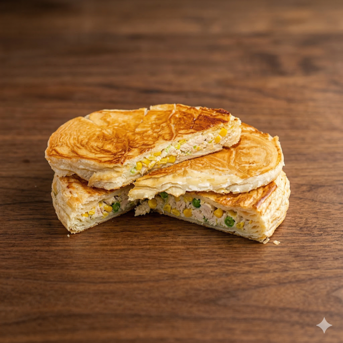Pollo jugoso y maíz tierno bajo una sábana de queso gratinado.