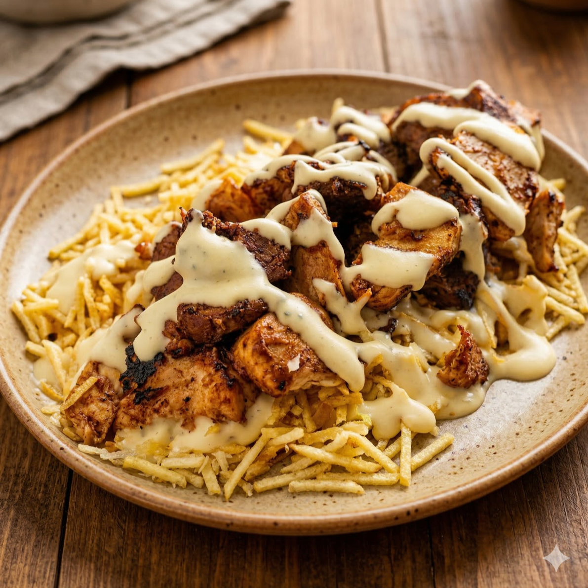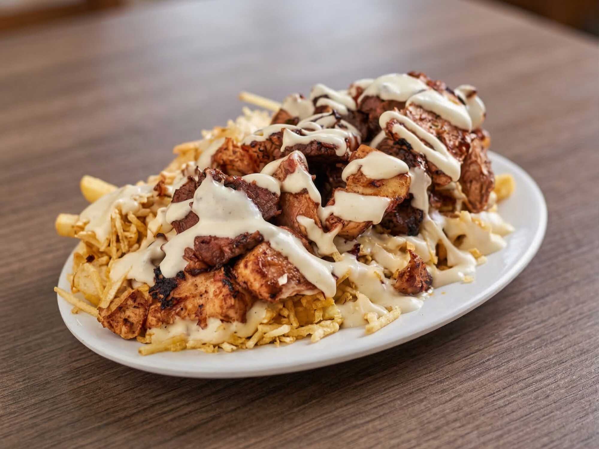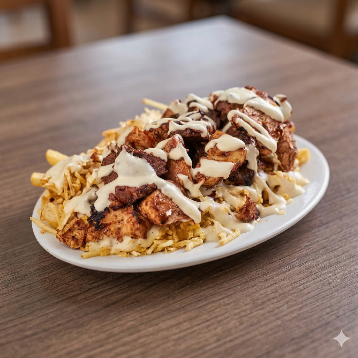 El trío perfecto: carne de res, pollo y salchicha sobre papas.
