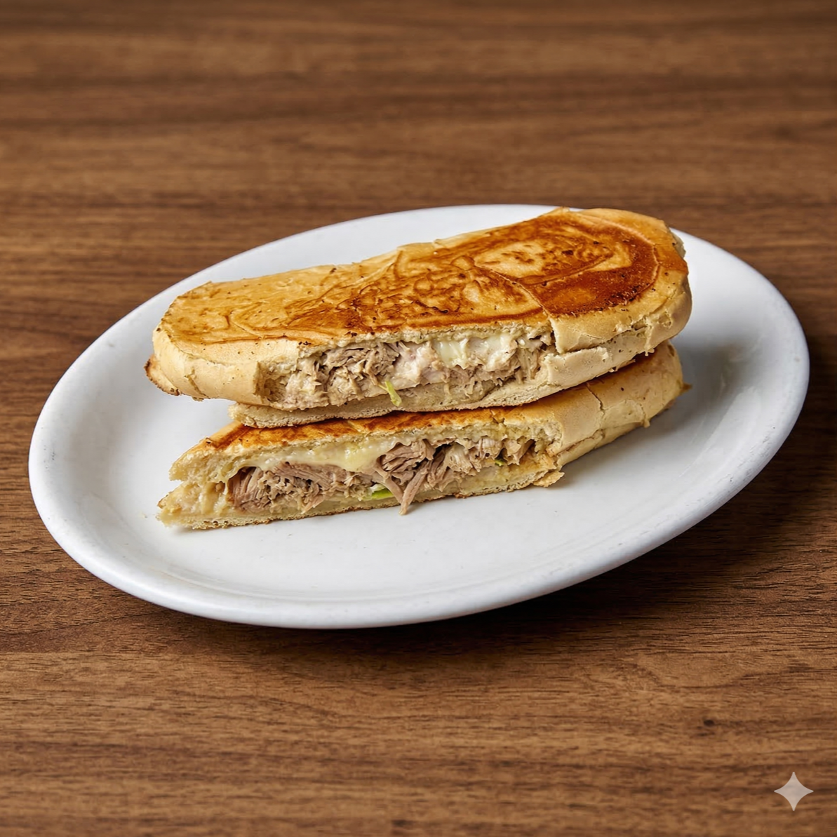 Jugoso pollo desmechado con sazón casera, servido en pan suave y fresco.
