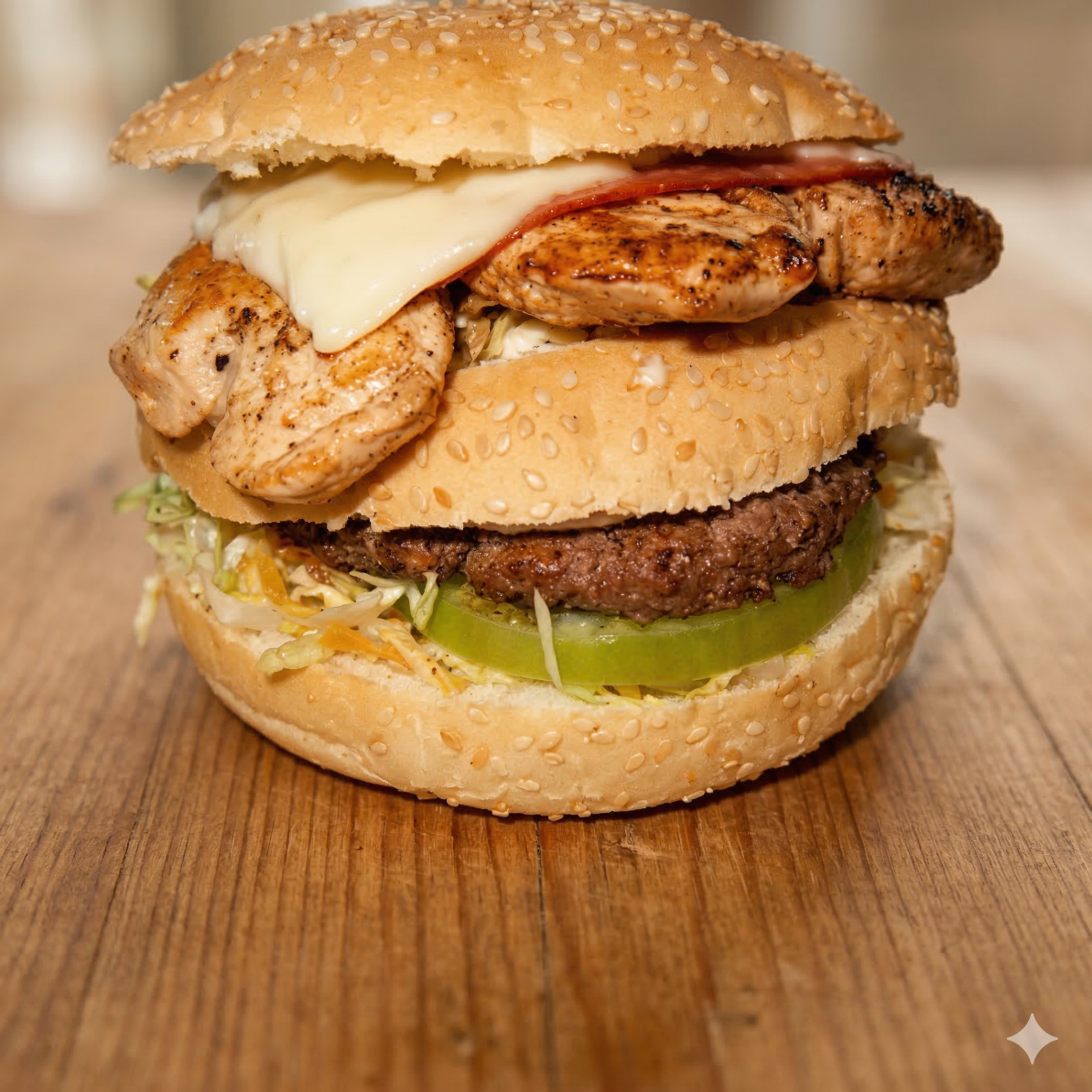 El combo ideal: carne de res y pollo desmechado en una sola hamburguesa.