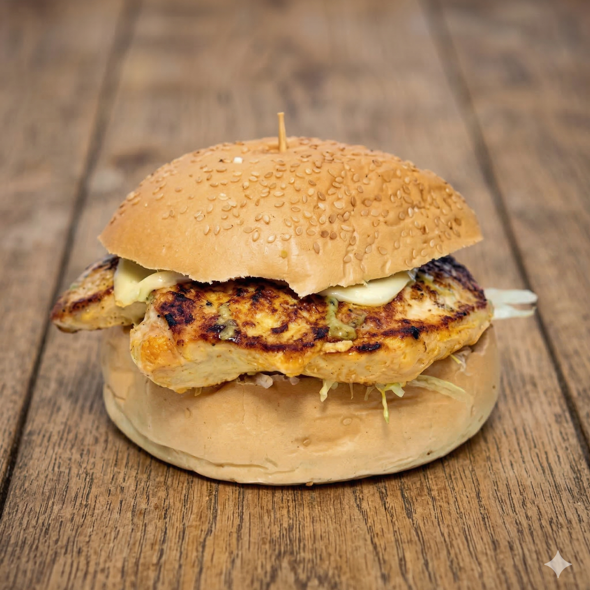 Filete de pechuga de pollo entera dentro de un pan artesanal crujiente.