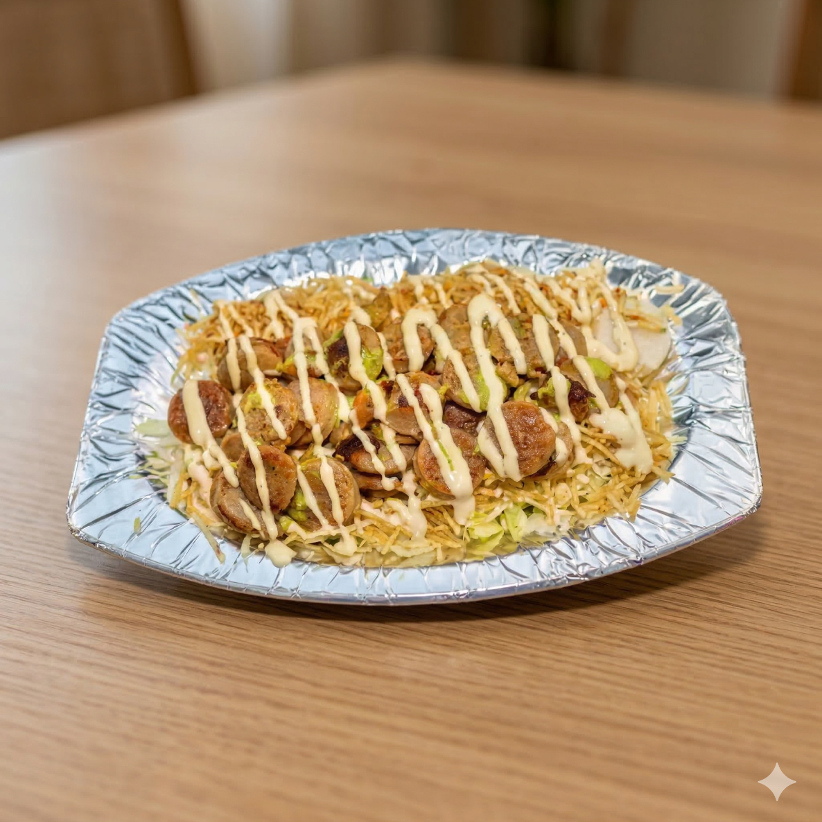 Papas a la francesa crujientes con salchicha picada y salsas clásicas.