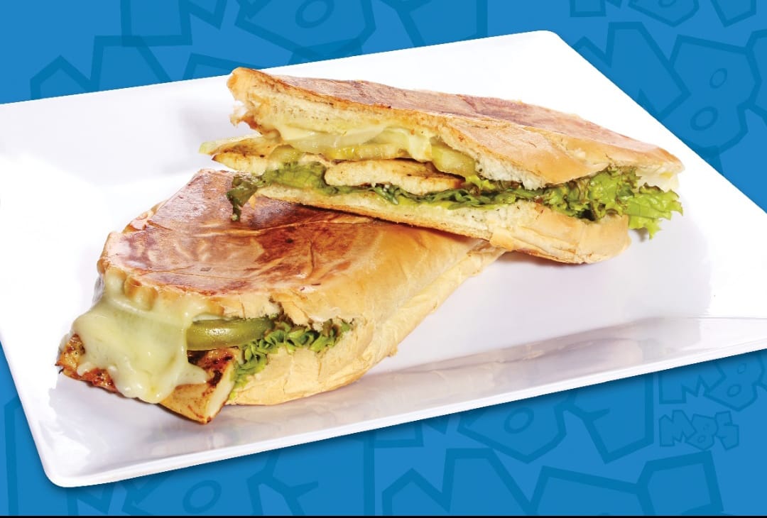 Pan francés, 80 g de pollo, jamón, queso, lechuga, salsa de tomate y mayonesa.